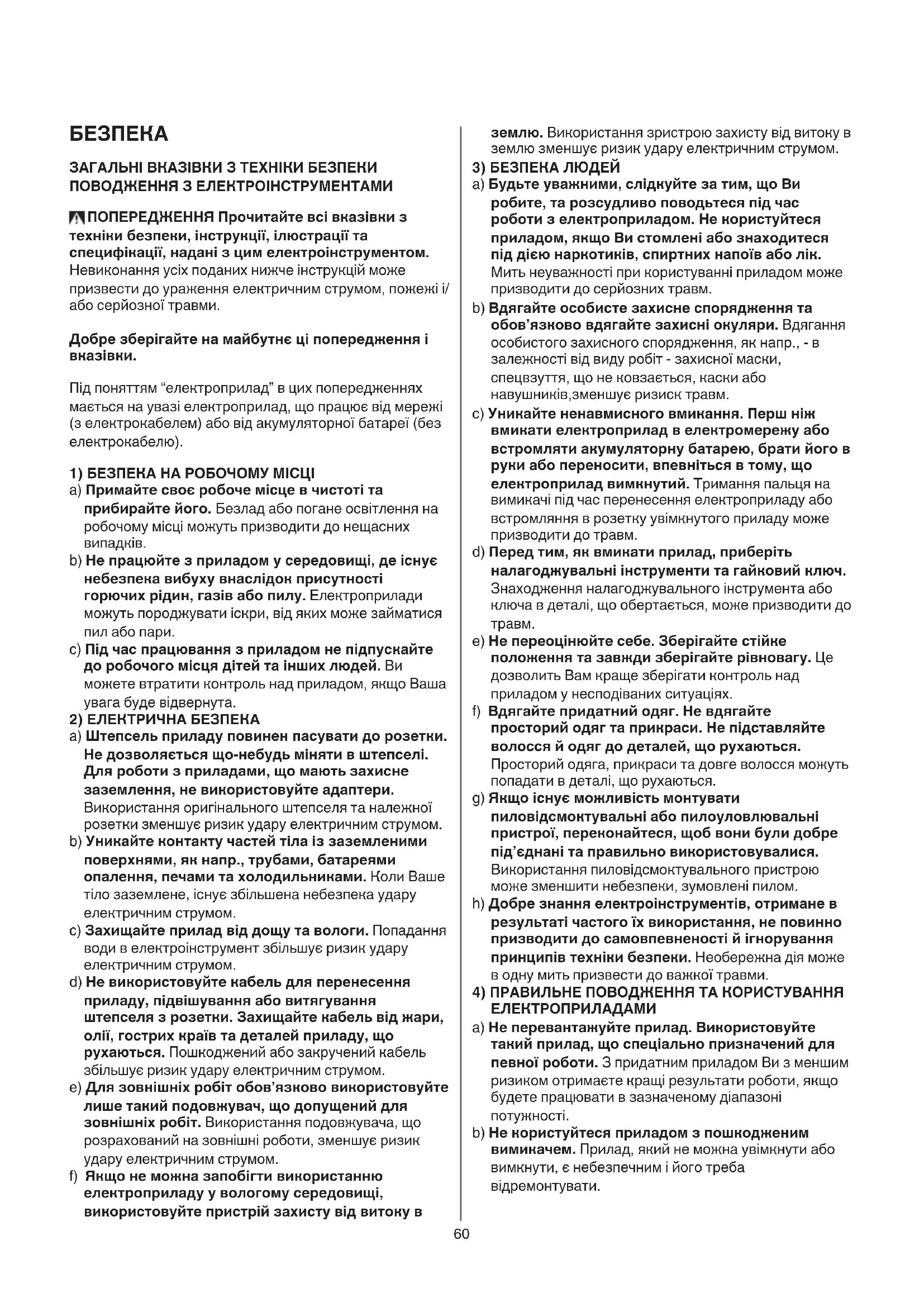 ЗАГАЛЬНІ ВКАЗІВКИ З ТЕХНІКИ БЕЗПЕКИ ПОВОДЖЕННЯ З ЕЛЕКТРОІНСТРУМЕНТАМИ ПОПЕРЕДЖЕННЯ Прочитайте всі вказівки з техніки безпеки, інструкції, ілюстрації та специфікації, надані з цим електроінструментом. Невиконання усіх поданих нижче інструкцій може призвести до ураження електричним струмом, пожежі і/ або серйозної травми. Добре зберігайте на майбутнє ці попередження і