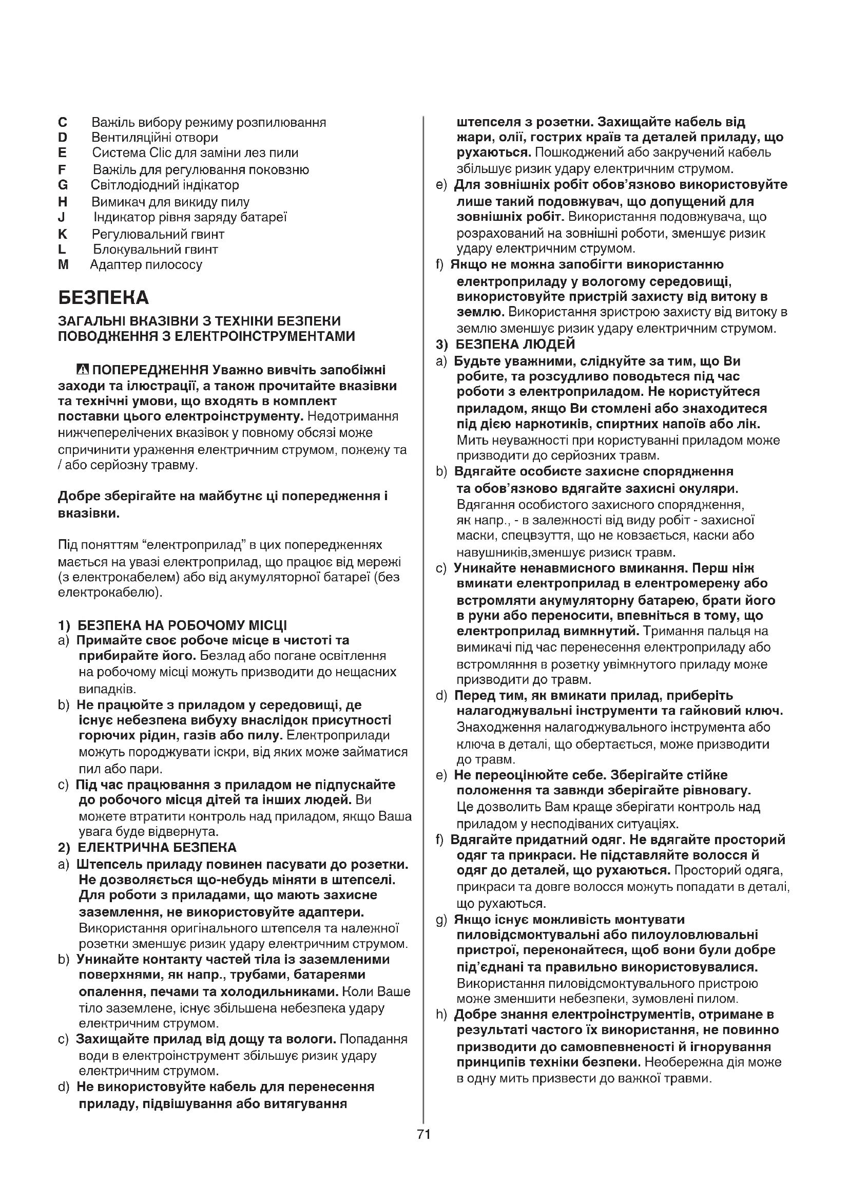 e) Не переоцінюйте себе. Зберігайте стійке положення та завжди зберігайте рівновагу. Це дозволить Вам краще зберігати контроль над приладом у несподіваних ситуаціях. f) Вдягайте придатний одяг. Не вдягайте просторий одяг та прикраси. Не підставляйте волосся й одяг до деталей, що рухаються. Просторий одяга, прикраси та довге волосся можуть попадати в деталі, що рухаються. g) Якщо існує можливість монтувати пиловідсмоктувальні або пилоуловлювальні пристрої, переконайтеся, щоб вони були добре під’єднані та правильно використовувалися. Використання пиловідсмоктувального пристрою може зменшити небезпеки, зумовлені пилом. h) Добре знання електроінструментів, отримане в результаті частого їх використання, не повинно призводити до самовпевненості й ігнорування принципів техніки безпеки. Необережна дія може в одну мить призвести до важкої травми. C Важіль вибору режиму розпилювання D Вентиляційні отвори E Система Clic для заміни лез пили F Важіль для регулювання поковзню G Світлодіодний індікатор H Вимикач для викиду пилу J Індикатор рівня заряду батареї K Регулювальний гвинт L Блокувальний гвинт M Aдаптер пилососy