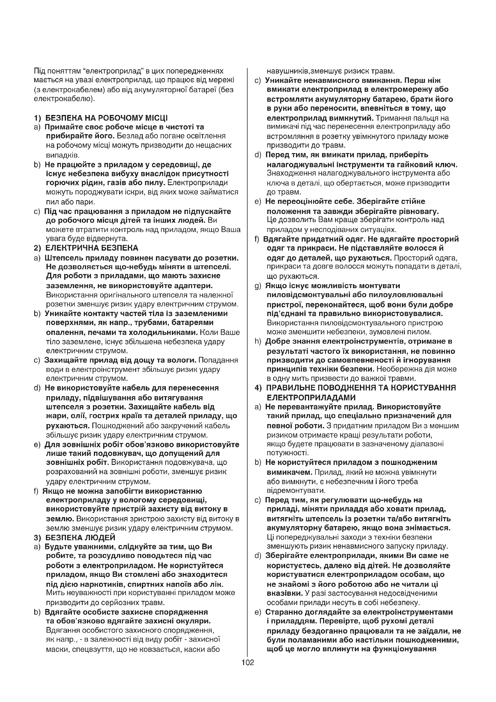 ЕЛЕКТРОПРИЛАДАМИ a) Не перевантажуйте прилад. Використовуйте такий прилад, що спеціально призначений для певної роботи. З придатним приладом Ви з меншим ризиком отримаєте кращі результати роботи, якщо будете працювати в зазначеному діапазоні потужності. b) Не користуйтеся приладом з пошкодженим вимикачем. Прилад, який не можна увімкнути або вимкнути, є небезпечним і його треба відремонтувати. c) Перед тим, як регулювати що-небудь на приладі, міняти приладдя або ховати прилад, витягніть штепсель із розетки та/або витягніть акумуляторну батарею, якщо вона знімається. Ці попереджувальні заходи з техніки безпеки зменшують ризик ненавмисного запуску приладу. d) Зберігайте електроприлади, якими Ви саме не користуєтесь, далеко від дітей. Не дозволяйте користуватися електроприладом особам, що не знайомі з його роботою або не читали ці вказівки. У разі застосування недосвідченими особами прилади несуть в собі небезпеку. e) Старанно доглядайте за електроінструментами і приладдям. Перевірте, щоб рухомі деталі приладу бездоганно працювали та не заїдали, не були поламаними або настільки пошкодженими, щоб це могло вплинути на функціонування Під поняттям “електроприлад” в цих попередженнях мається на увазі електроприлад, що працює від мережі (з електрокабелем) або від акумуляторної батареї (без електрокабелю).