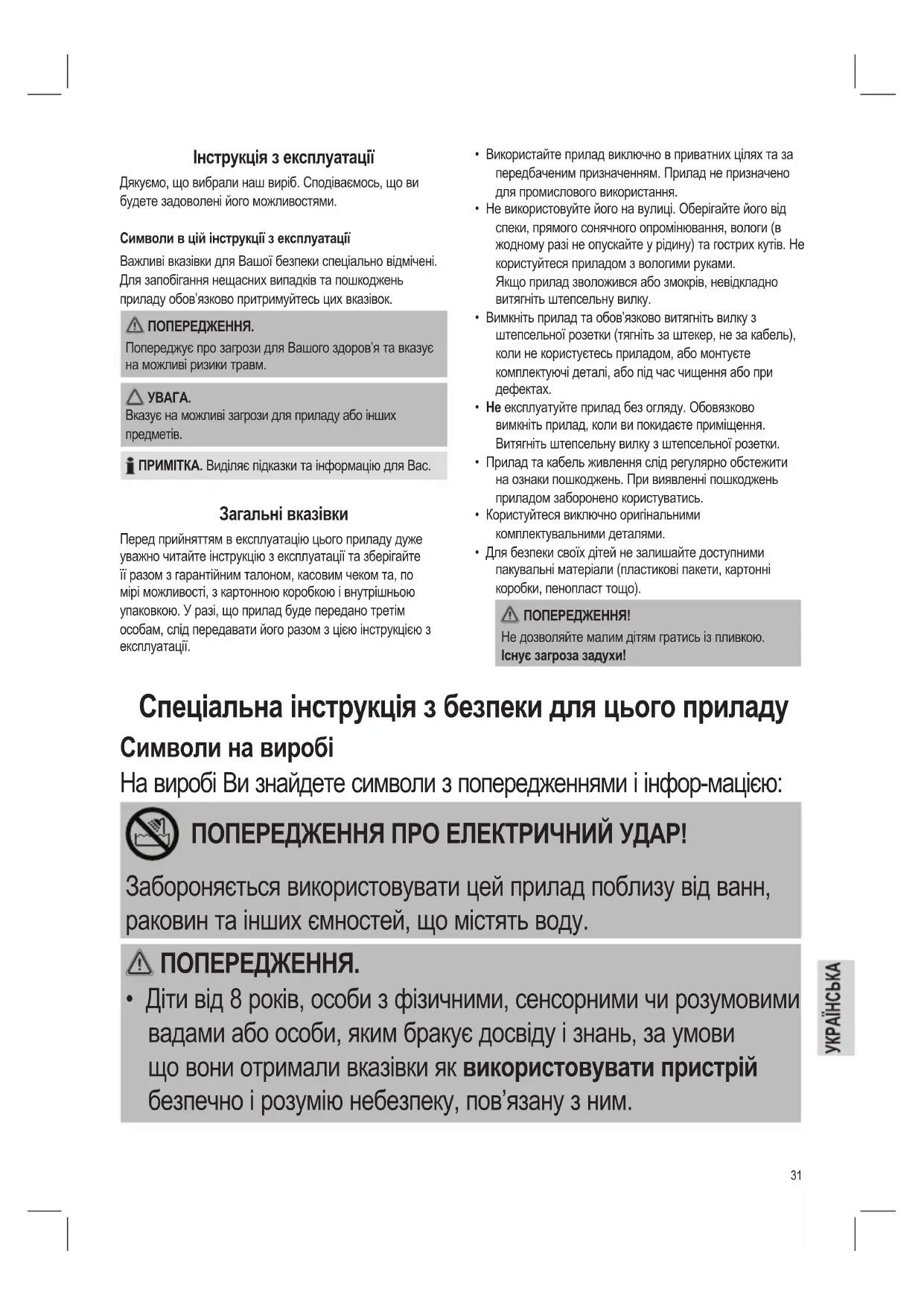 ПРИМІТКА. Виділяє підказки та інформацію для Вас. Загальні вказівки Перед прийняттям в експлуатацію цього приладу дуже уважно читайте інструкцію з експлуатації та зберігайте її разом з гарантійним талоном, касовим чеком та, по мірі можливості, з картонною коробкою і внутрішньою упаковкою. У разі, що прилад буде передано третім особам, слід передавати його разом з цією інструкцією з експлуатації. Спеціальна інструкція з безпеки для цього приладу Символи на виробі На виробі Ви знайдете символи з попередженнями і інфор-мацією: ПОПЕРЕДЖЕННЯ ПРО ЕЛЕКТРИЧНИЙ УДАР! Забороняється використовувати цей прилад поблизу від ванн, раковин та інших ємностей, що містять воду. ПОПЕРЕДЖЕННЯ.