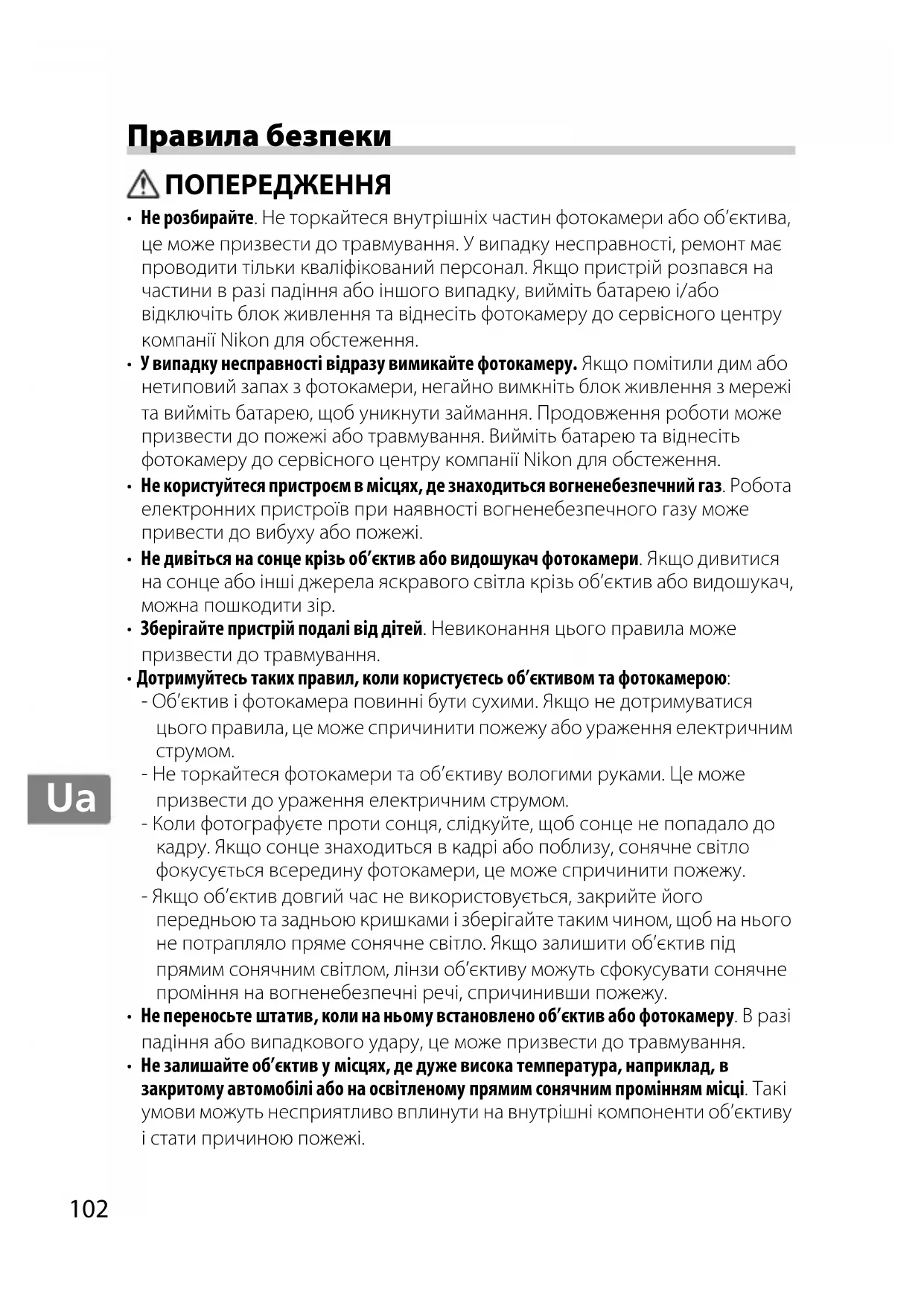 - Не розбирайте. Не торкайтеся внутрішніх частин фотокамери або об’єктива, це може призвести до травмування. У випадку несправності, ремонт має проводити тільки кваліфікований персонал. Якщо пристрій розпався на частини в разі падіння або іншого випадку, вийміть батарею і/або відключіть блок живлення та віднесіть фотокамеру до сервісного центру компанії Nikon для обстеження.