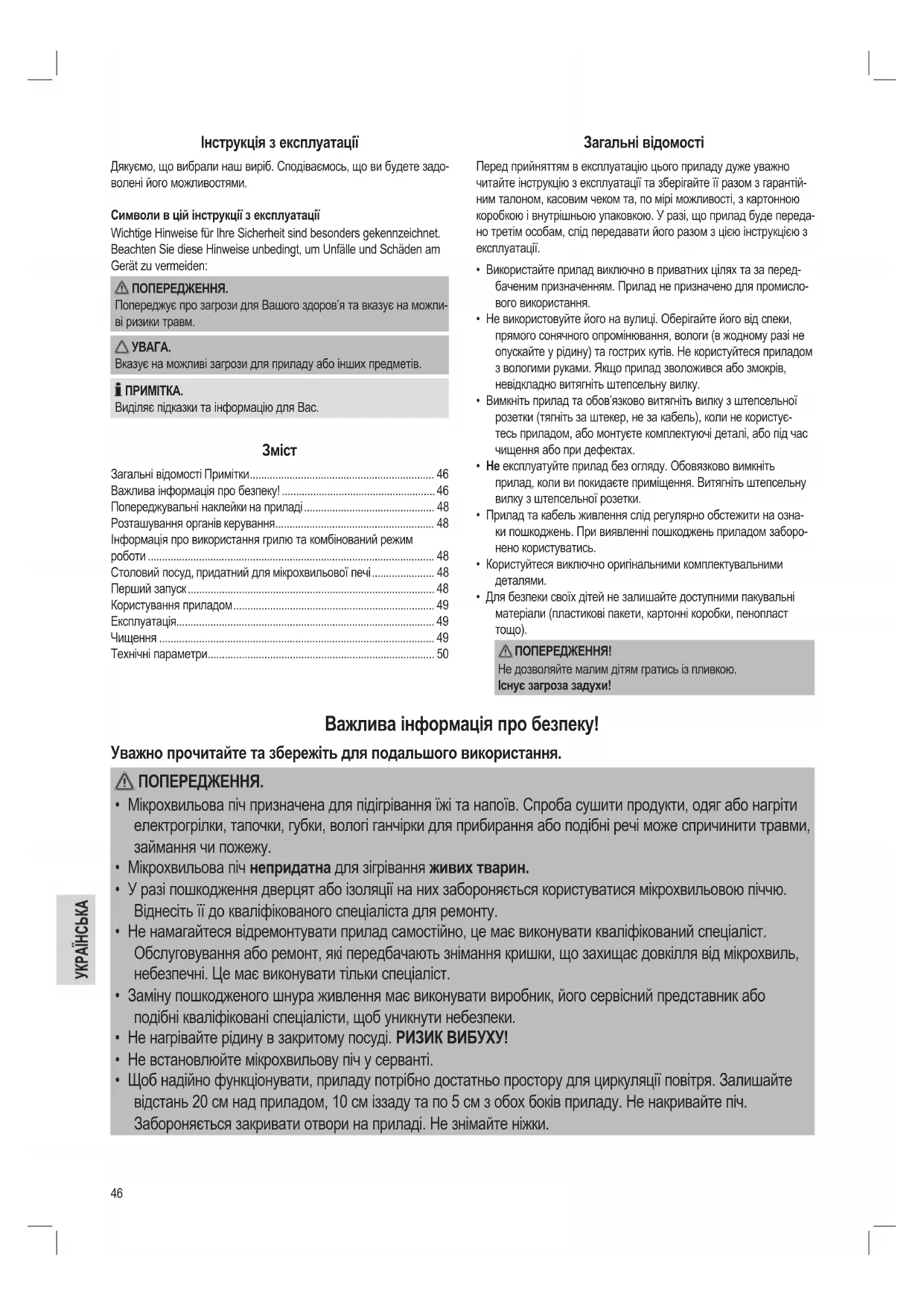 - Інформація про використання грилю та комбінований режим роботи p. 48