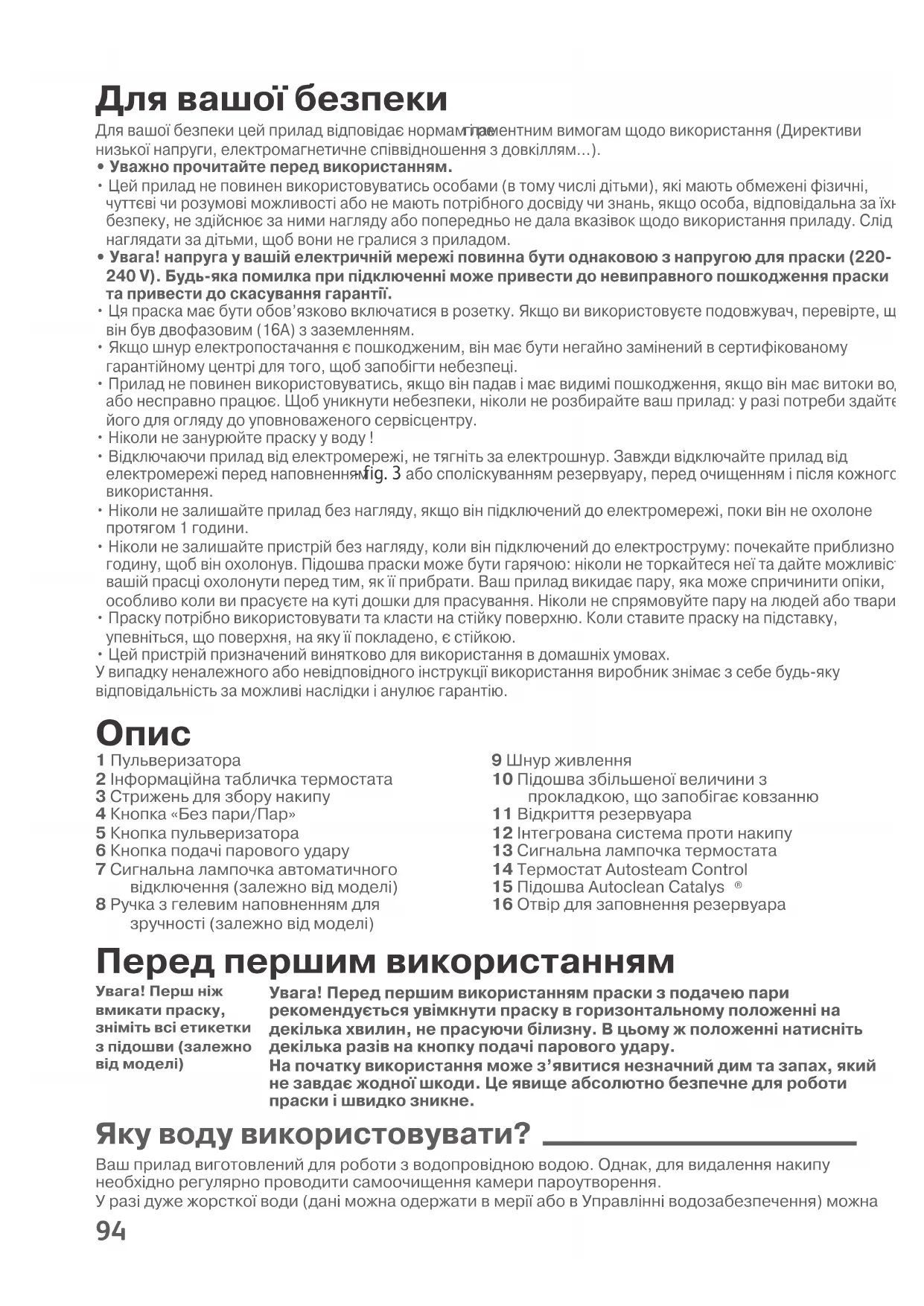 При любых других возможных неполадках обращайтесь вавторизованный сервисный центр для проверки утюга. UltimateAutoclean-1800113015-110x154:Mise en page 1 23/07/08 9:18 Page 9394 Для вашої безпеки Для вашої безпеки цей прилад вiдповiдає нормам i регламентним вимогам щодо використання (Директивинизької напруги, електромагнетичне спiввiдношення з довкiллям...).• Уважно прочитайте перед використанням.• Цей прилад не повинен використовуватись особами (в тому числi дiтьми), якi мають обмеженi фiзичнi,чуттєвi чи розумовi можливостi або не мають потрiбного досвiду чи знань, якщо особа, вiдповiдальна за їхнюбезпеку, не здiйснює за ними нагляду або попередньо не дала вказiвок щодо використання приладу. Слiднаглядати за дiтьми, щоб вони не гралися з приладом.• Увага! напруга у вашiй електричнiй мережi повинна бути однаковою з напругою для праски (220-240 V). Будь-яка помилка при пiдключеннi може привести до невиправного пошкодження праскита привести до скасування гарантiї.• Ця праска має бути обов’язково включатися в розетку. Якщо ви використовуєте подовжувач, перевiрте, щобвiн був двофазовим (16А) з заземленням.• Якщо шнур електропостачання є пошкодженим, вiн має бути негайно замiнений в сертифiкованомугарантiйному центрi для того, щоб запобiгти небезпецi.• Прилад не повинен використовуватись, якщо вiн падав i має видимi пошкодження, якщо вiн має витоки водиабо несправно працює. Щоб уникнути небезпеки, нiколи не розбирайте ваш прилад: у разi потреби здайтейого для огляду до уповноваженого сервiсцентру.• Нiколи не занурюйте праску у воду !• Вiдключаючи прилад вiд електромережi, не тягнiть за електрошнур. Завжди вiдключайте прилад вiделектромережi перед наповненням - fig. 3 або сполiскуванням резервуару, перед очищенням i пiсля кожного використання.• Нiколи не залишайте прилад без нагляду, якщо вiн пiдключений до електромережi, поки вiн не охолонепротягом 1 години.• Нiколи не залишайте пристрiй без нагляду, коли вiн пiдключений до електроструму: почекайте приблизногодину, щоб вiн охолонув. Пiдошва праски може бути гарячою: нiколи не торкайтеся неї та дайте можливiстьвашiй прасцi охолонути перед тим, як її прибрати. Ваш прилад викидає пару, яка може спричинити опiки,особливо коли ви прасуєте на кутi дошки для прасування. Нiколи не спрямовуйте пару на людей або тварин.• Праску потрiбно використовувати та класти на стiйку поверхню. Коли ставите праску на пiдставку,упевнiться, що поверхня, на яку її покладено, є стiйкою.• Цей пристрiй призначений винятково для використання в домашнiх умовах.У випадку неналежного або невiдповiдного iнструкцiї використання виробник знiмає з себе будь-якувiдповiдальнiсть за можливi наслiдки i анулює гарантiю. 1 Пульверизатора2 Інформаційна табличка термостата3 Стрижень для збору накипу4 Кнопка «Без пари/Пар»5 Кнопка пульверизатора6 Кнопка подачi парового удару7 Сигнальна лампочка автоматичноговiдключення (залежно вiд моделi)8 Ручка з гелевим наповненням длязручності (залежно від моделі)9 Шнур живлення10 Пiдошва збiльшеної величини зпрокладкою, що запобiгає ковзанню11 Відкриття резервуара12 Інтегрована система проти накипу13 Сигнальна лампочка термостата14 Термостат Autosteam Control15 Підошва Autoclean Catalys 16 Отвiр для заповнення резервуара Перед першим використанням Увага! Перед першим використанням праски з подачею парирекомендується увiмкнути праску в горизонтальному положеннi надекiль