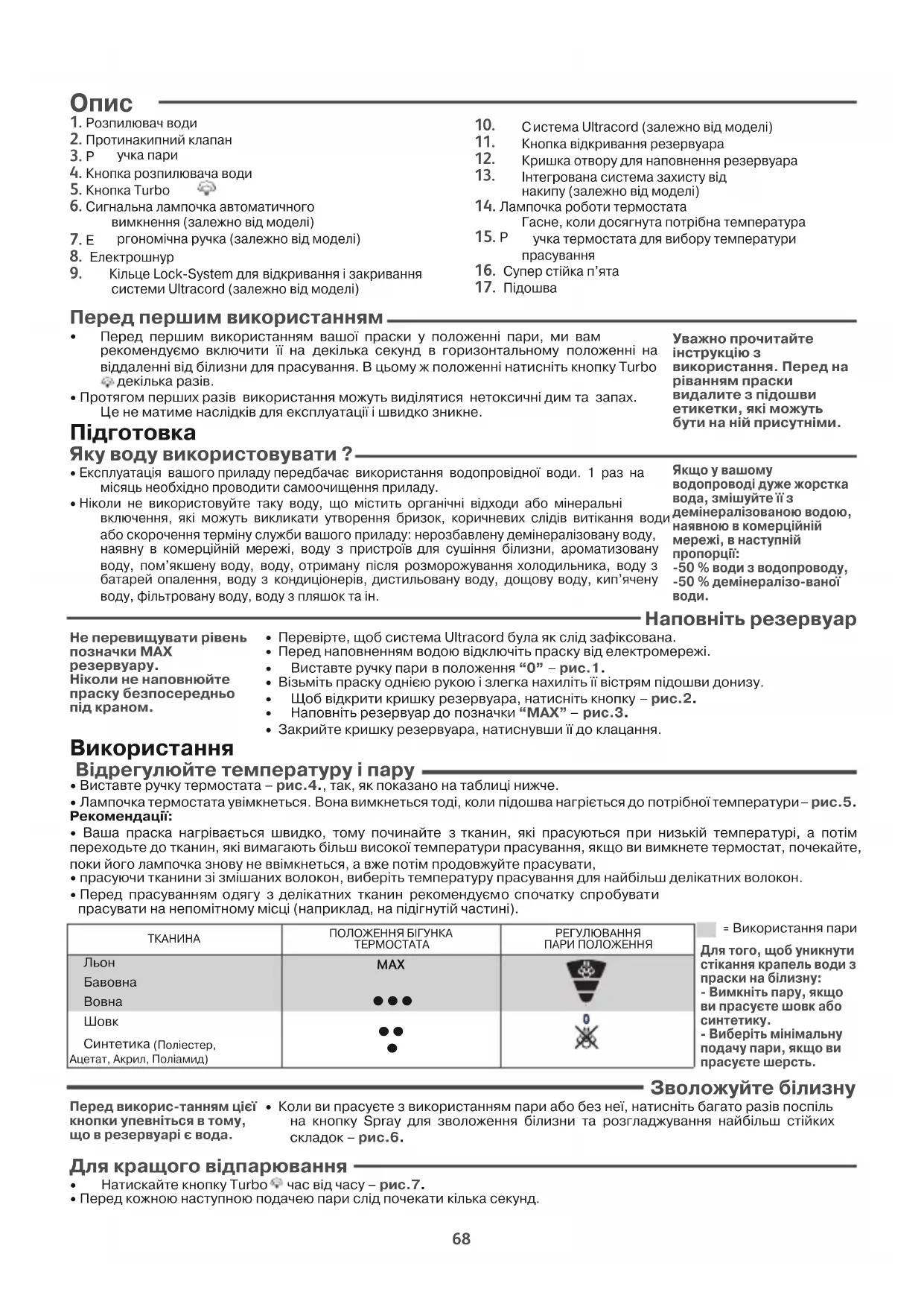 Перед першим використанням вашої праски у положеннi пари, ми вам рекомендуємо включити її на декiлька секунд в горизонтальному положеннi на вiддаленнi вiд бiлизни для прасування. В цьому ж положеннi натиснiть кнопку Turboдекiлька разiв. • Протягом перших разiв використання можуть видiлятися нетоксичнi дим та запах. е не матиме наслiдкiв для експлуатацiї i швидко зникне. Пiдготовка Яку воду використовувати ?