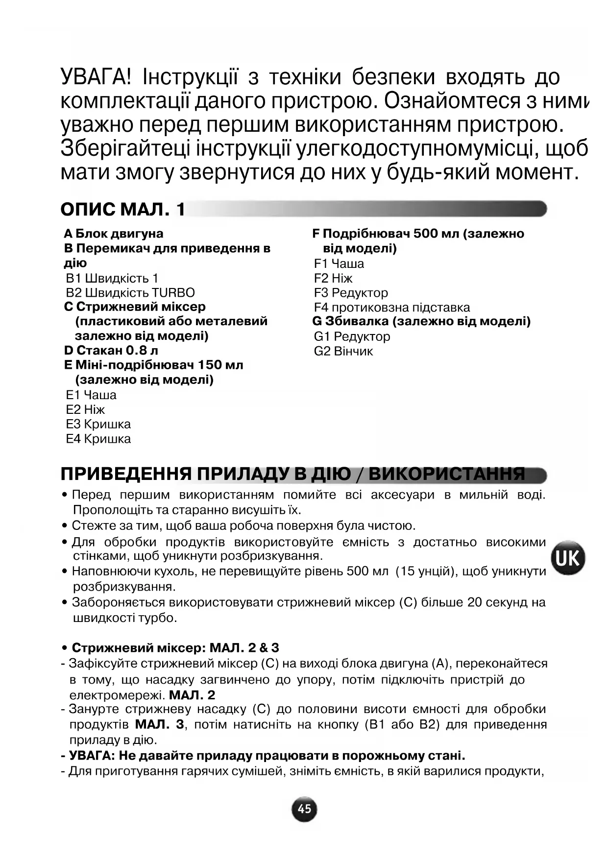 УВАГА! Інструкції з техніки безпеки входять до комплектації даного пристрою. Ознайомтеся з ними уважно перед першим використанням пристрою. Зберігайтеці інструкції улегкодоступномумісці, щоб мати змогу звернутися до них у будь-який момент. ОПИС МАЛ. 1 ПРИВЕДЕННЯ ПРИЛАДУ В ДІЮ / ВИКОРИСТАННЯ