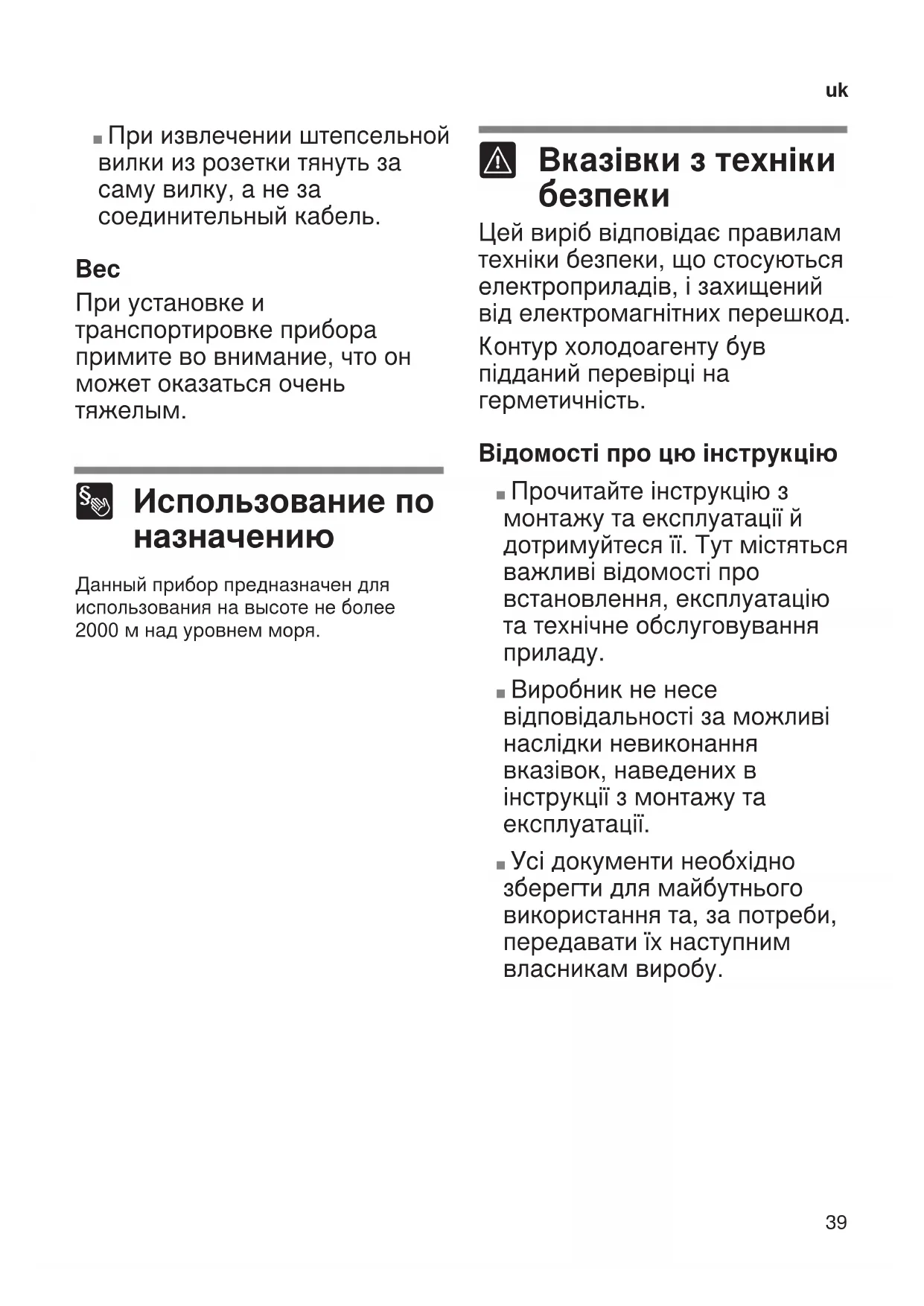 Цей виріб відповідає правилам техніки безпеки, що стосуються електроприладів, і захищений від електромагнітних перешкод. Контур холодоагенту був підданий перевірці на герметичність. Відомості про цю інструкцію ■ Прочитайте інструкцію з монтажу та експлуатації й дотримуйтеся її. Тут містяться важливі відомості про встановлення, експлуатацію та технічне обслуговування
