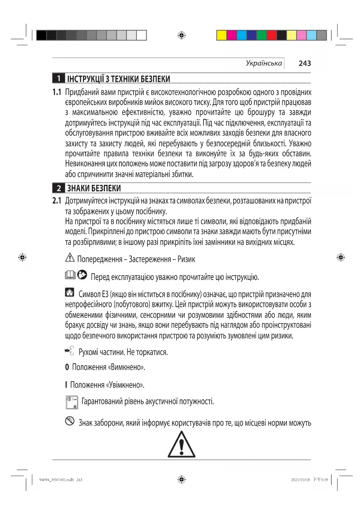 та зображених у цьому посібнику. На пристрої та в посібнику містяться лише ті символи, які відповідають придбаній моделі. Прикріплені до пристрою символи та знаки завжди мають бути присутніми та розбірливими; в іншому разі прикріпіть їхні замінники на вихідних місцях. Попередження– Застереження– Ризик Перед експлуатацією уважно прочитайте цю інструкцію. Символ E3 (якщо він міститься в посібнику) означає, що пристрій призначено для непрофесійного (побутового) вжитку. Цей пристрій можуть використовувати особи з обмеженими фізичними, сенсорними чи розумовими здібностями або люди, яким бракує досвіду чи знань, якщо вони перебувають під наглядом або проінструктовані щодо безпечного використання пристрою та розуміють зумовлені цим ризики. Рухомі частини. Не торкатися. 0 Положення «Вимкнено». I Положення «Увімкнено». Гарантований рівень акустичної потужності. Знак заборони, який інформує користувачів про те, що місцеві норми можуть 94694_HW101.indb 24394694_HW101.indb 243 2021/10/18 下午5:192021/10/18 下午5:19244