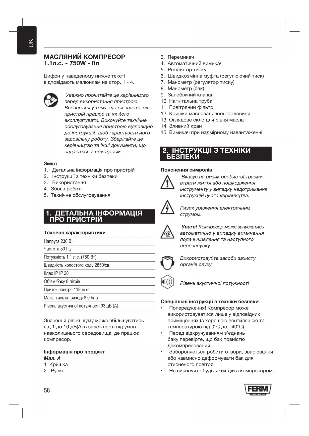 Увага!Компресорможезапускатись автоматичноувипадкувимкнення подачіживленнятанаступного перезапуску Використовуйтезасобизахисту органівслуху Рівеньакустичноїпотужності