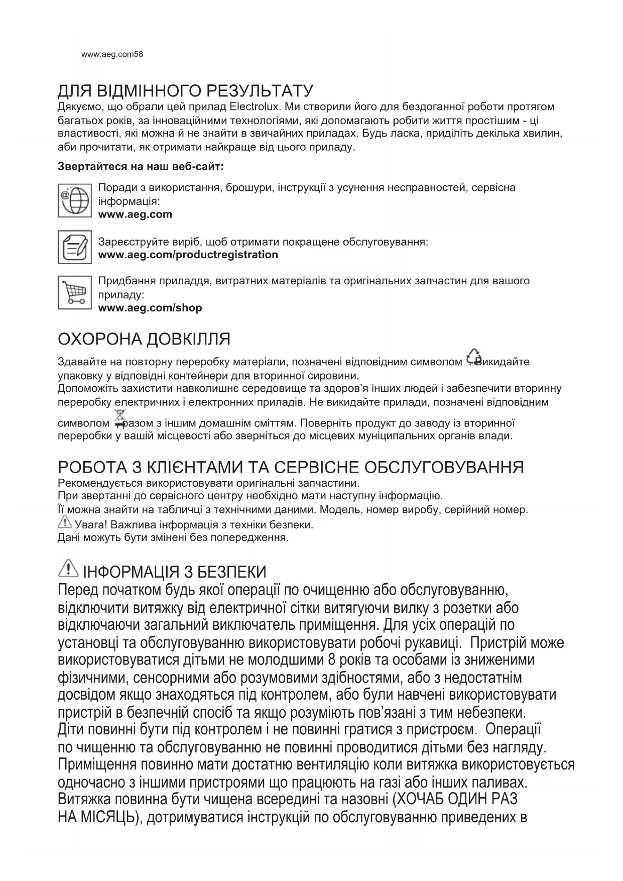 www.aeg.com/shop ОХОРОНА ДОВКІЛЛЯ Здавайте на повторну переробку матеріали, позначені відповідним символом . Викидайте упаковку у відповідні контейнери для вторинної сировини. Допоможіть захистити навколишнє середовище та здоров’я інших людей і забезпечити вторинну переробку електричних і електронних приладів. Не викидайте прилади, позначені відповідним символом , разом з іншим домашнім сміттям. Поверніть продукт до заводу із вторинної переробки у вашій місцевості або зверніться до місцевих муніципальних органів влади. РОБОТА З КЛІЄНТАМИ ТА СЕРВІСНЕ ОБСЛУГОВУВАННЯ Рекомендується використовувати оригінальні запчастини. При звертанні до сервісного центру необхідно мати наступну інформацію. Її можна знайти на табличці з технічними даними. Модель, номер виробу, серійний номер. Увага! Важлива інформація з техніки безпеки. Дані можуть бути змінені без попередження. ІНФОРМАЦІЯ З БЕЗПЕКИ Перед початком будь якої операції по очищенню або обслуговуванню, відключити витяжку від електричної сітки витягуючи вилку з розетки або відключаючи загальний виключатель приміщення. Для усіх операцій по установці та обслуговуванню використовувати робочі рукавиці. Пристрій може використовуватися дітьми не молодшими 8 років та особами із зниженими фізичними, сенсорними або розумовими здібностями, або з недостатнім досвідом якщо знаходяться під контролем, або були навчені використовувати пристрій в безпечній спосіб та якщо розуміють пов’язані з тим небезпеки. Діти повинні бути під контролем і не повинні гратися з пристроєм. Операції по чищенню та обслуговуванню не повинні проводитися дітьми без нагляду. Приміщення повинно мати достатню вентиляцію коли витяжка використовується одночасно з іншими пристроями що працюють на газі або інших паливах. Витяжка повинна бути чищена всередині та назовні (ХОЧАБ ОДИН РАЗ НА МІСЯЦЬ), дотримуватися інструкцій по обслуговуванню приведених в UK ІНСТРУКЦІЯ З ЕКСПЛУАТАЦІЇ59