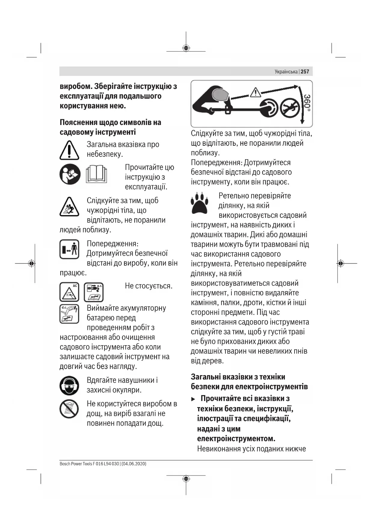 Вказівки з техніки безпеки Увага! Уважно прочитайте наступні вказівки. Ознайомтеся з елементами управління і правилами користування F 016 L94 030 | (04.06.2020) Bosch Power ToolsУкраїнська | 257 виробом. Зберігайте інструкцію з експлуатації для подальшого користування нею. Пояснення щодо символів на садовому інструменті Загальна вказівка про