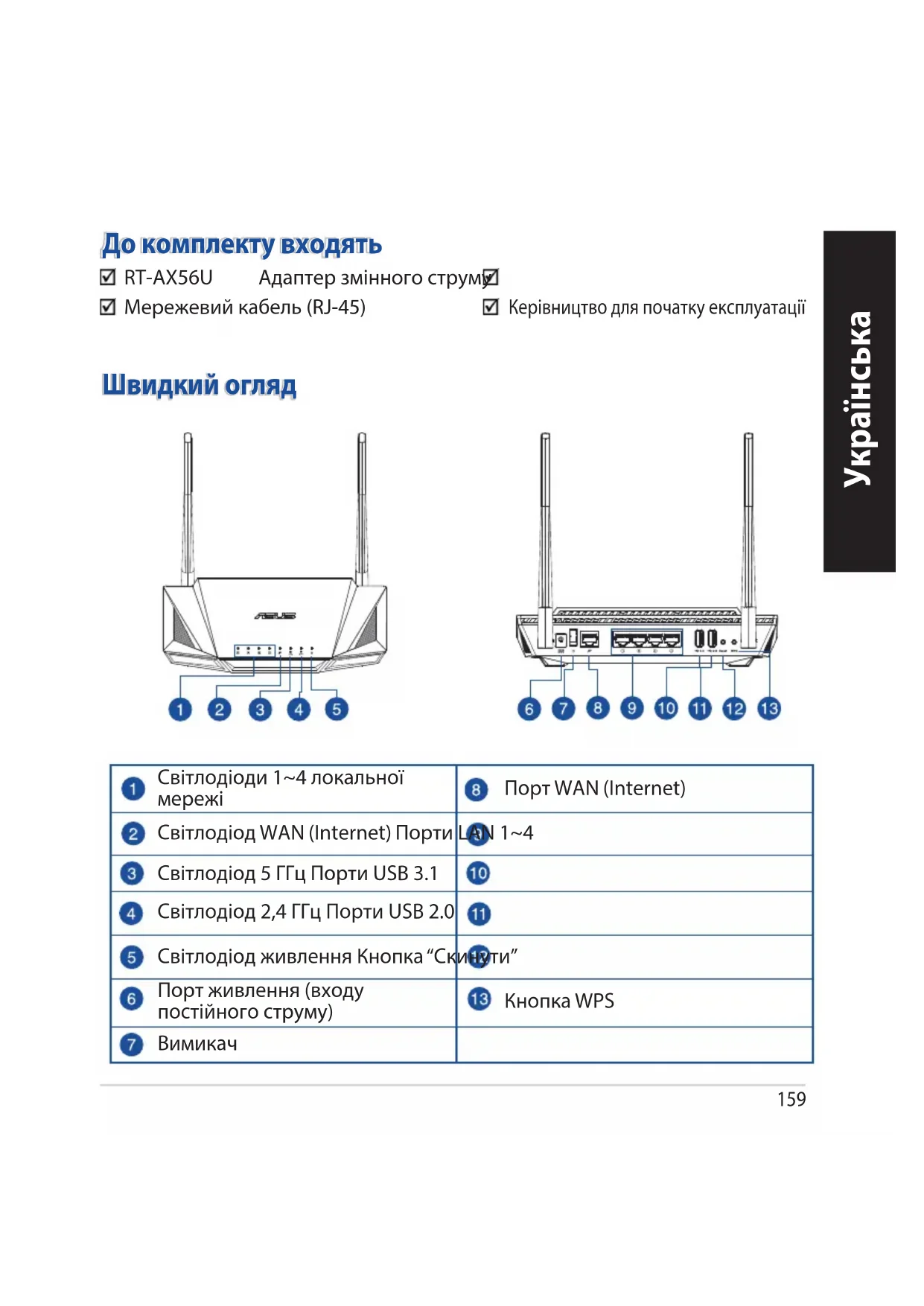 Порт WAN (Internet) Світлодіод WAN (Internet) Порти LAN 1~4 Світлодіод 5 ГГц Порти USB 3.1 Світлодіод 2,4 ГГц Порти USB 2.0 Світлодіод живлення Кнопка “Скинути” Порт живлення (входу постійного струму) Кнопка WPS Вимикач160