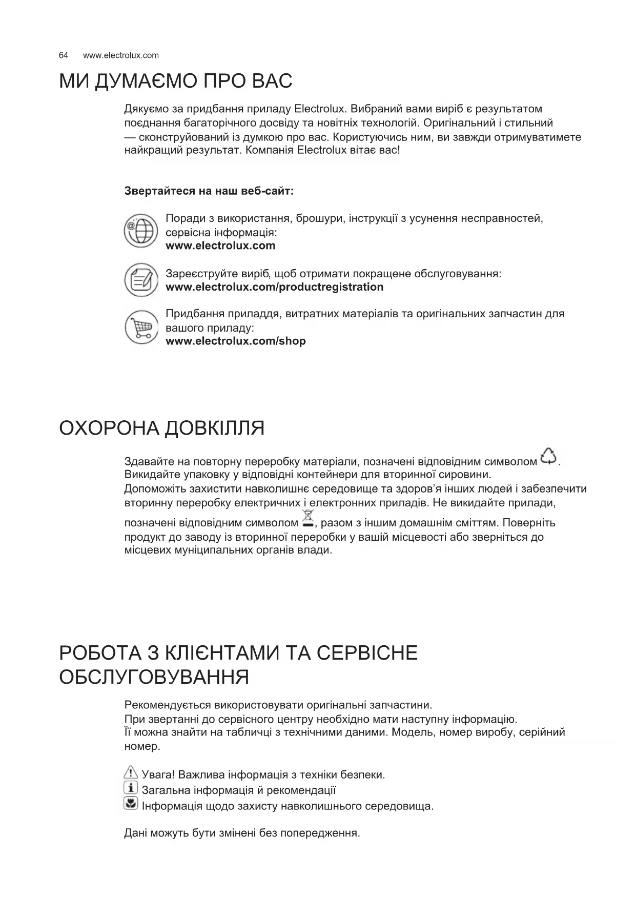 Дякуємо за придбання приладу Electrolux. Вибраний вами виріб є результатом поєднання багаторічного досвіду та новітніх технологій. Оригінальний і стильний — сконструйований із думкою про вас. Користуючись ним, ви завжди отримуватимете найкращий результат. Компанія Electrolux вітає вас! Звертайтеся на наш веб-сайт: Поради з використання, брошури, інструкції з усунення несправностей, сервісна інформація: www.electrolux.com Зареєструйте виріб , щоб отримати покращене обслуговування: www.electrolux.com/productregistration Придбання приладдя, витратних матеріалів та оригінальних запчастин для вашого приладу: www.electrolux.com/shop МИ ДУМАЄМО ПРО ВАС ОХОРОНА ДОВКІЛЛЯ Здавайте на повторну переробку матеріали, позначені відповідним символом . Викидайте упаковку у відповідні контейнери для вторинної сировини. Допоможіть захистити навколишнє середовище та здоров’я інших людей і забезпечити вторинну переробку електричних і електронних приладів. Не викидайте прилади, позначені відповідним символом , разом з іншим домашнім сміттям. Поверніть продукт до заводу із вторинної переробки у вашій місцевості або зверніться до місцевих муніципальних органів влади. РОБОТА З КЛІЄНТАМИ ТА СЕРВІСНЕ ОБСЛУГОВУВАННЯ Рекомендується використовувати оригінальні запчастини. При звертанні до сервісного центру необхідно мати наступну інформацію. Її можна знайти на табличці з технічними даними. Модель, номер виробу, серійний