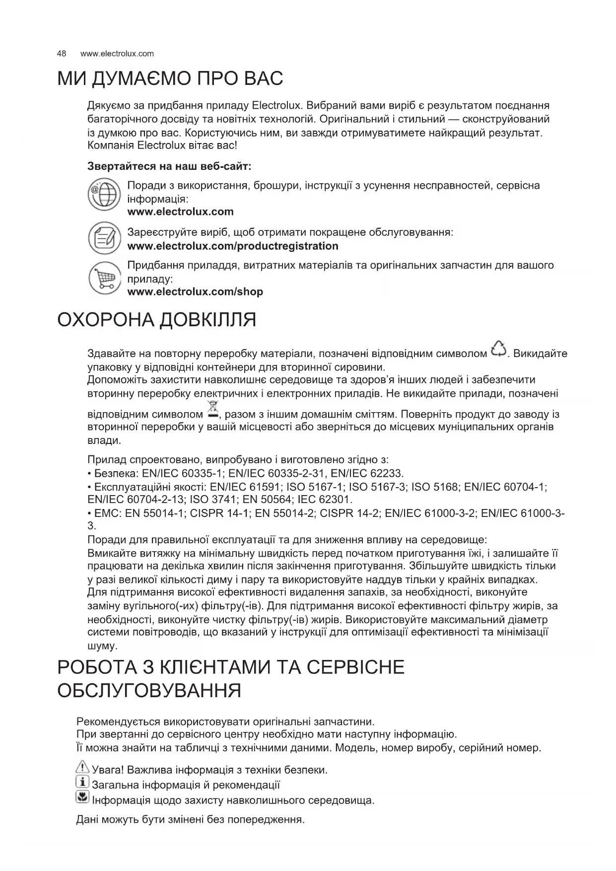 РОБОТА З КЛІЄНТАМИ ТА СЕРВІСНЕ ОБСЛУГОВУВАННЯ Рекомендується використовувати оригінальні запчастини. При звертанні до сервісного центру необхідно мати наступну інформацію. Її можна знайти на табличці з технічними даними. Модель, номер виробу, серійний номер. Увага! Важлива інформація з техніки безпеки. Загальна інформація й рекомендації Інформація щодо захисту навколишнього середовища. Дані можуть бути змінені без попередження. UK ІН