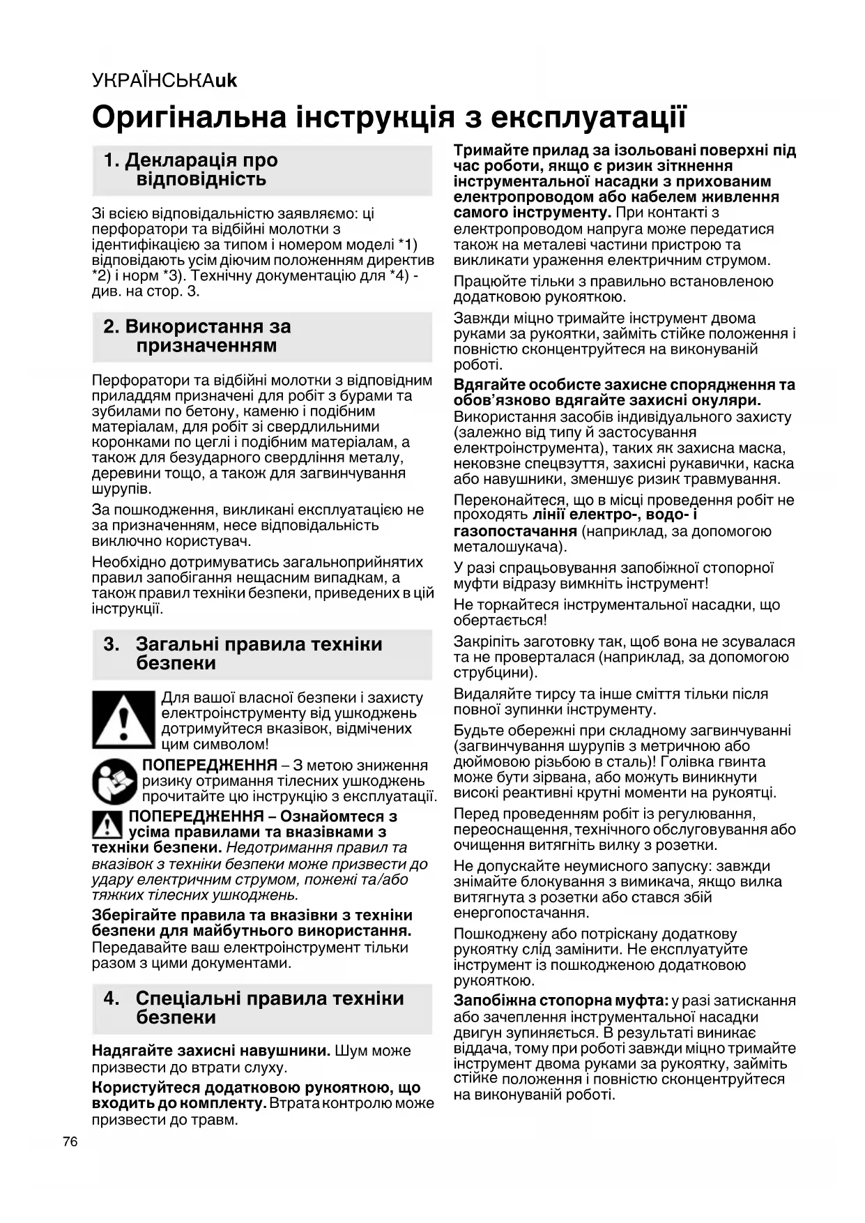 Зі всією відповідальністю заявляємо: ці перфоратори та відбійні молотки з ідентифікацією за типом і номером моделі *1) відповідають усім діючим положенням директив *2) і норм *3). Технічну документацію для *4) - див. на стор. 3. Перфоратори та відбійні молотки з відповідним приладдям призначені для робіт з бурами та зубилами по бетону, каменю і подібним матеріалам, для робіт зі свердлильними коронками по цеглі і подібним матеріалам, а також для безударного свердління металу, деревини тощо, а також для загвинчування