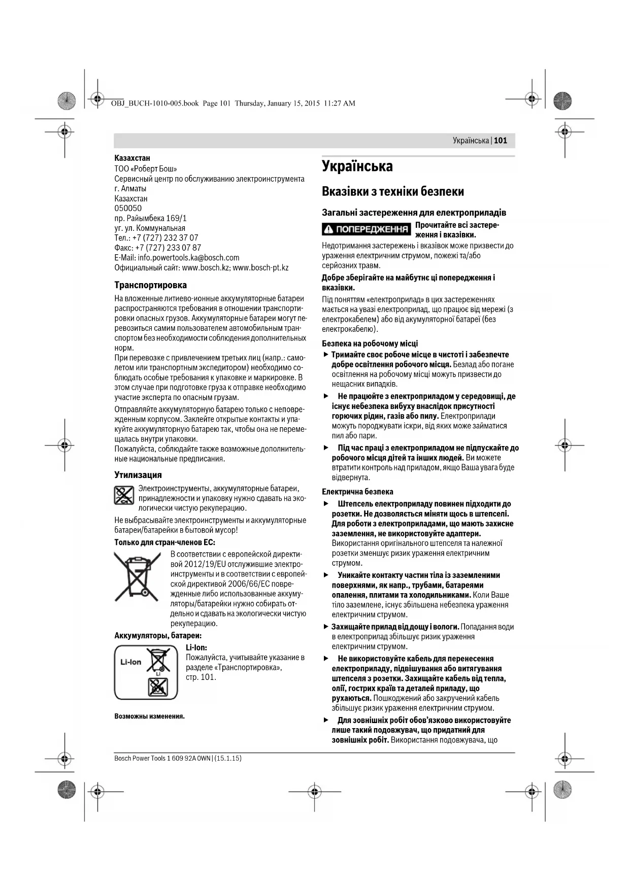Електроприлади, акумуляторні батареї, приладдя і упаковку треба здавати на екологічно чисту повторну переробку. Не викидайте електроприлади та акумуляторні батареї/батарейки в побутове сміття! OBJ_BUCH-1010-005.book Page 106 Thursday, January 15, 2015 11:27 AMҚaзақша | 107 Bosch Power Tools 1 609 92A 0WN | (15.1.15) Лише для країн ЄС: Відповідно до європейської директиви 2012/19/EU електро- і електронні прилади, що вийшли з вживання, та відповідно до європейської директиви 2006/66/EC пошкоджені або відпра- цьовані акумуляторні батареї/батарейки повинні здаватися окремо і утилізуватися екологічно чистим способом. Акумулятори/батарейки: Літієво-іонні: Будь ласка, зважайте на вказівки в розділі «Транспортування», стор. 106. Можливі зміни. Қaзақша Сәйкестік туралы сертификат Нөмірi KZ.75000.52.22.01.00637 Сәйкестік туралы сертификаттың қолданылу мерзімі 12.11.2018 дейін „Онiмд, кызметтi сертификатту орталыгы“