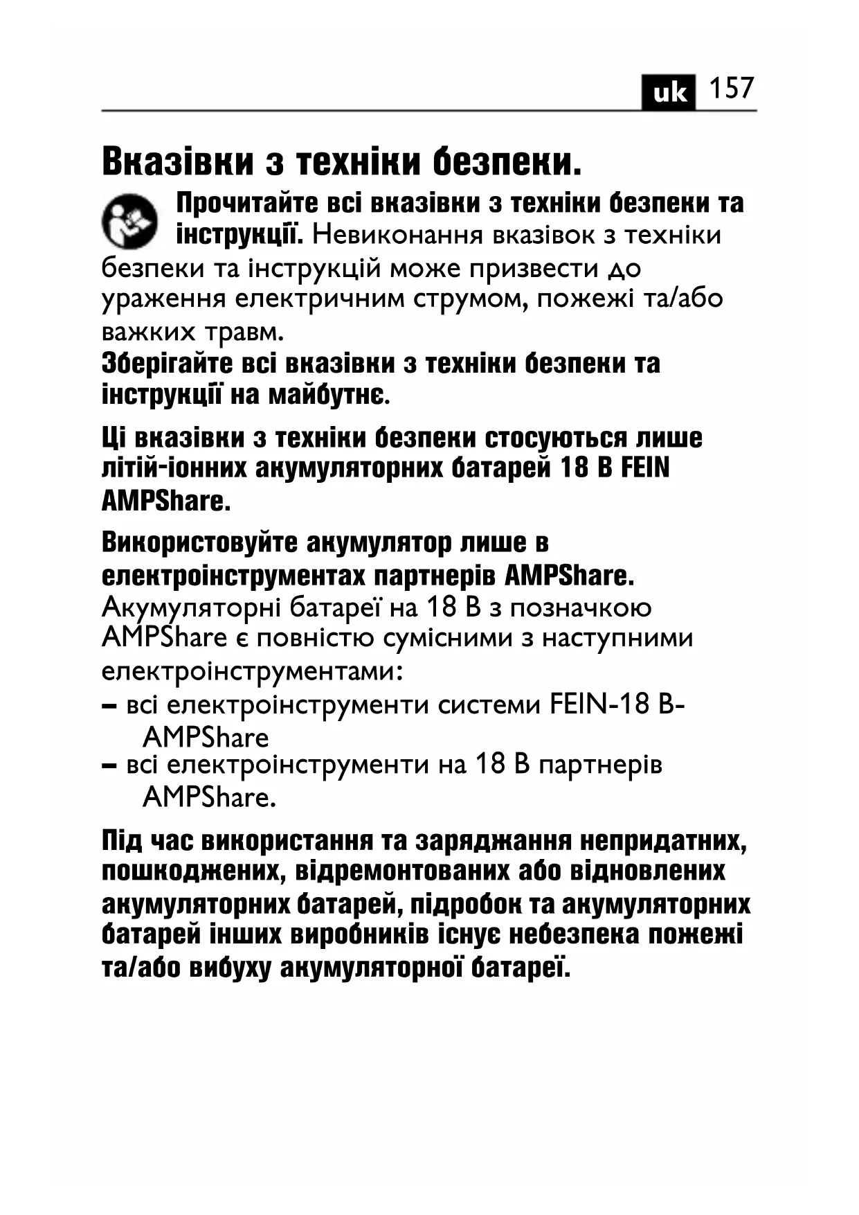 Вказівки з техніки безпеки. Прочитайте всі вказівки з техніки безпеки та інструкції. Невиконання вказівок з техніки безпеки та інструкцій може призвести до ураження електричним струмом, пожежі та/або важких травм. Зберігайте всі вказівки з техніки безпеки та інструкції на майбутнє. Ці вказівки з техніки безпеки стосуються лише літій-іонних акумуляторних батарей 18 В FEIN AMPShare. Використовуйте акумулятор лише в електроінструментах партнерів AMPShare. Акумуляторні батареї на 18 В з позначкою AMPShare є повністю сумісними з наступними електроінструментами: – всі електроінструменти системи FEIN-18 В- AMPShare – всі електроінструменти на 18 В партнерів AMPShare. Під час використання та заряджання непридатних, пошкоджених, відремонтованих або відновлених акумуляторних батарей, підробок та акумуляторних батарей інших виробників існує небезпека пожежі та/або вибуху акумуляторної батареї.158