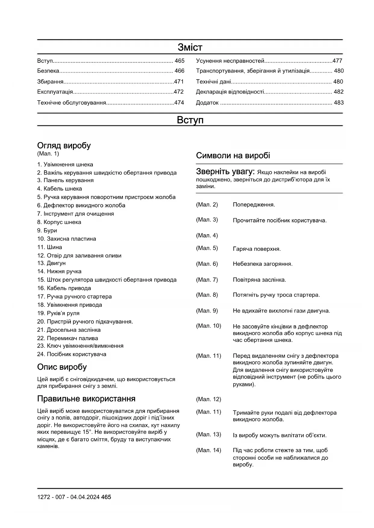 (Мал. 2) Попередження. (Мал. 3) Прочитайте посібник користувача. (Мал. 4) (Мал. 5) Гаряча поверхня. (Мал. 6) Небезпека загоряння. (Мал. 7) Повітряна заслінка. (Мал. 8) Потягніть ручку троса стартера. (Мал. 9) Не вдихайте вихлопні гази двигуна. (Мал. 10) Не засовуйте кінцівки в дефлектор викидного жолоба або корпус шнека під час обертання шнека. (Мал. 11) Перед видаленням снігу з дефлектора викидного жолоба зупиняйте двигун. Для видалення снігу використовуйте відповідний інструмент (не робіть цього