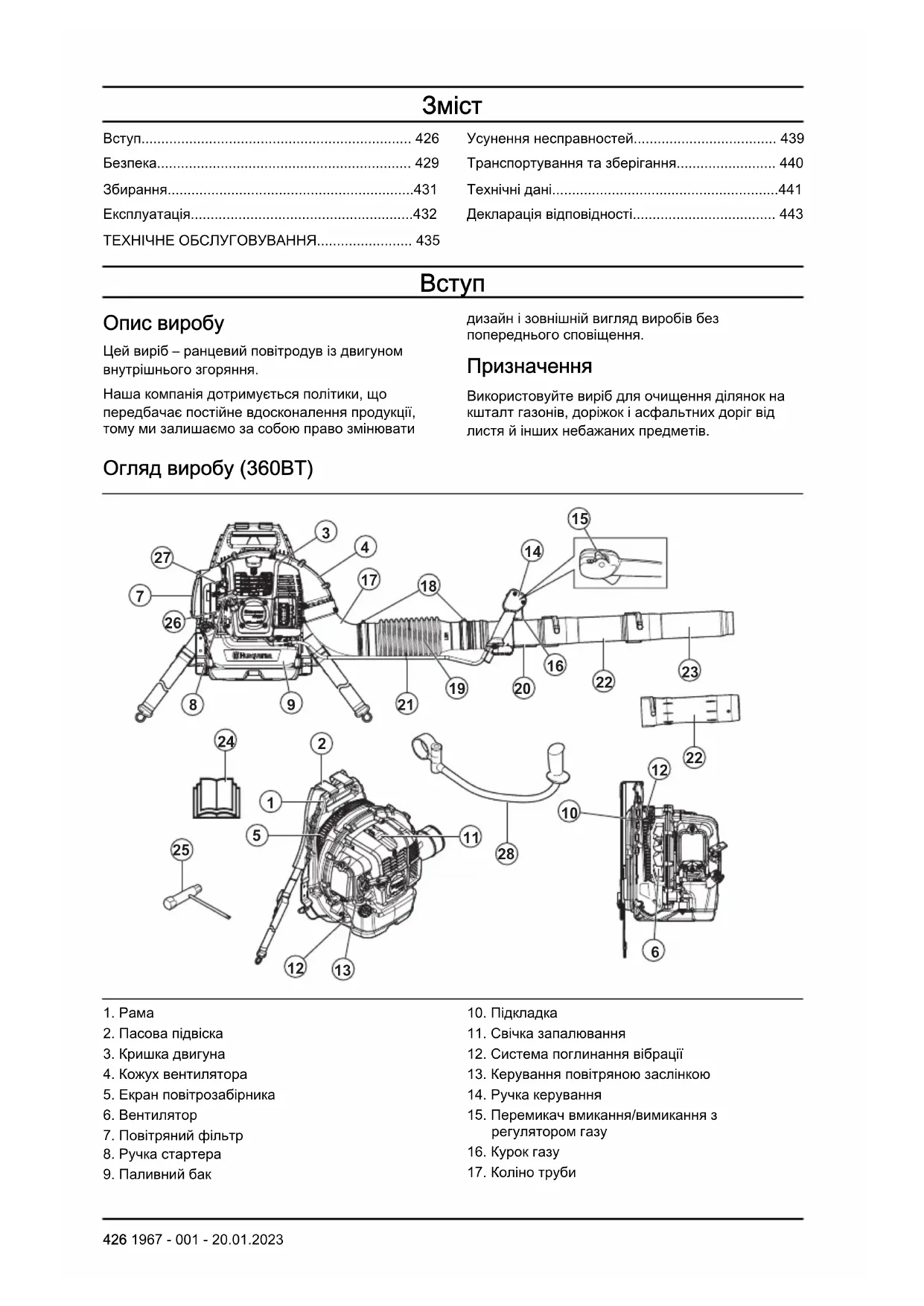 Опис виробу Цей виріб– ранцевий повітродув із двигуном внутрішнього згоряння. Наша компанія дотримується політики, що передбачає постійне вдосконалення продукції, тому ми залишаємо за собою право змінювати дизайн і зовнішній вигляд виробів без попереднього сповіщення. Призначення Використовуйте виріб для очищення ділянок на кшталт газонів, доріжок і асфальтних доріг від листя й інших небажаних предметів. Огляд виробу (360BT)