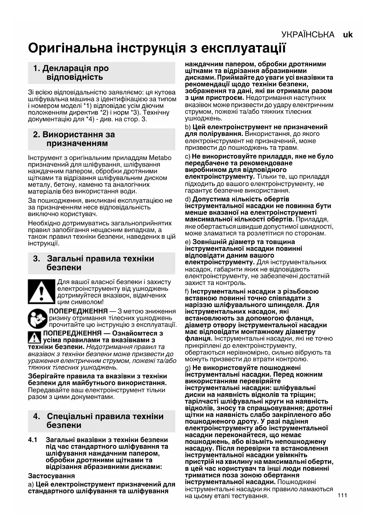 Оригінальна інструкція з експлуатації Зі всією відповідальністю заявляємо: ця кутова шліфувальна машина з ідентифікацією за типом і номером моделі *1) відповідає усім діючим положенням директив *2) і норм *3). Технічну документацію для *4) - див. на стор. 3. Інструмент з оригінальним приладдям Metabo призначений для шліфування, шліфування наждачним папером, обробки дротяними щітками та відрізання шліфувальним диском металу, бетону, каменю та аналогічних