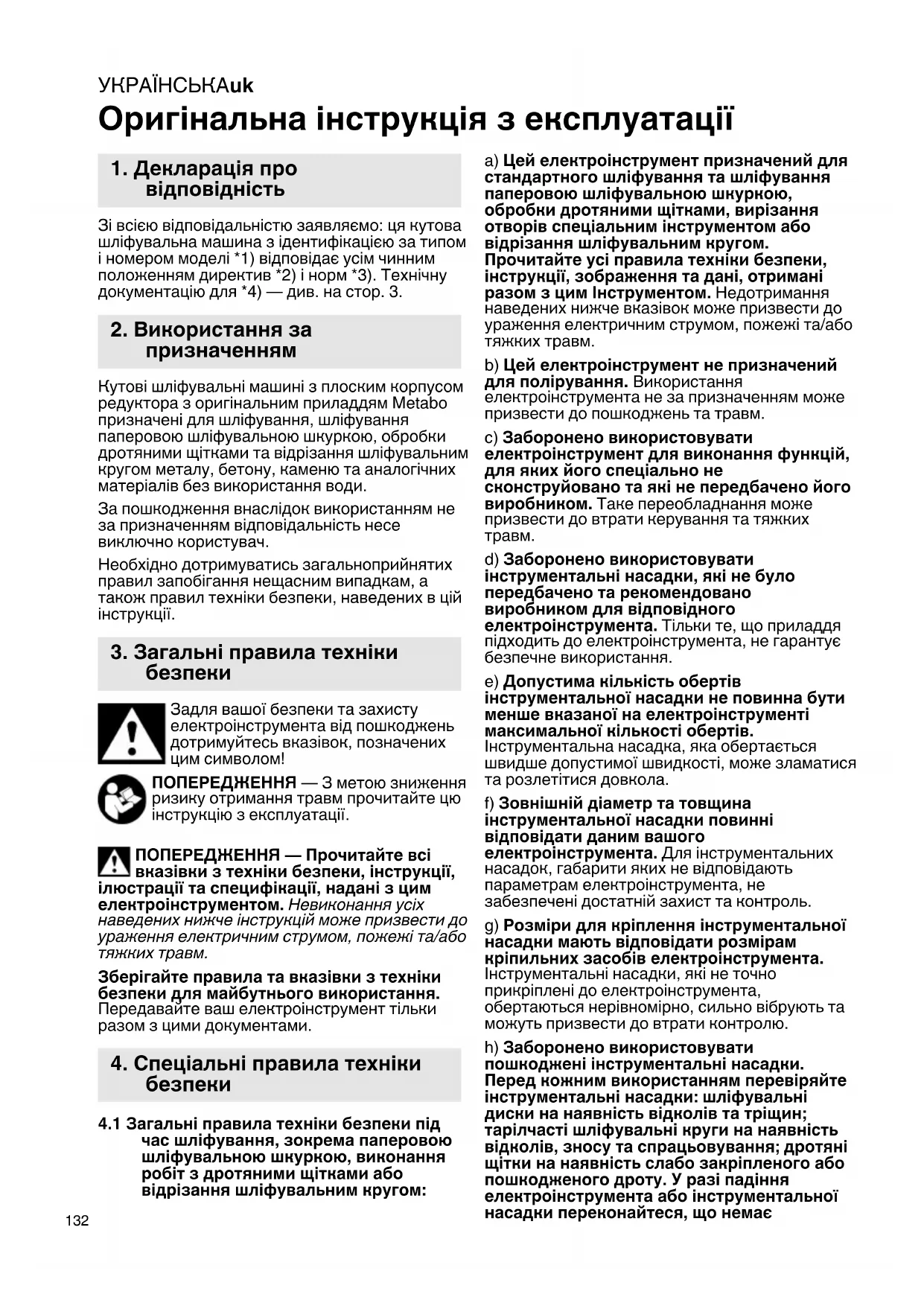 Оригінальна інструкція з експлуатації Зі всією відповідальністю заявляємо: ця кутова шліфувальна машина з ідентифікацією за типом і номером моделі *1) відповідає усім чинним положенням директив *2) і норм *3). Технічну документацію для *4) — див. на стор. 3. Кутові шліфувальні машині з плоским корпусом редуктора з оригінальним приладдям Metabo призначені для шліфування, шліфування паперовою шліфувальною шкуркою, обробки дротяними щітками та відрізання шліфувальним кругом металу, бетону, каменю та аналогічних матеріалів без використання води. За пошкодження внаслідок використанням не за призначенням відповідальність несе виключно користувач. Необхідно дотримуватись загальноприйнятих правил запобігання нещасним випадкам, а також правил техніки безпеки, наведених в цій інструкції. Задля вашої безпеки та захисту електроінструмента від пошкоджень дотримуйтесь вказівок, позначених цим символом! ПОПЕРЕДЖЕННЯ — З метою зниження ризику отримання травм прочитайте цю інструкцію з експлуатації. ПОПЕРЕДЖЕННЯ — Прочитайте всі вказівки з техніки безпеки, інструкції, ілюстрації та специфікації, надані з цим електроінструментом. Невиконання усіх наведених нижче інструкцій може призвести до ураження електричним струмом, пожежі та/або тяжких травм. Зберігайте правила та вказівки з техніки безпеки для майбутнього використання. Передавайте ваш електроінструмент тільки разом з цими документами.