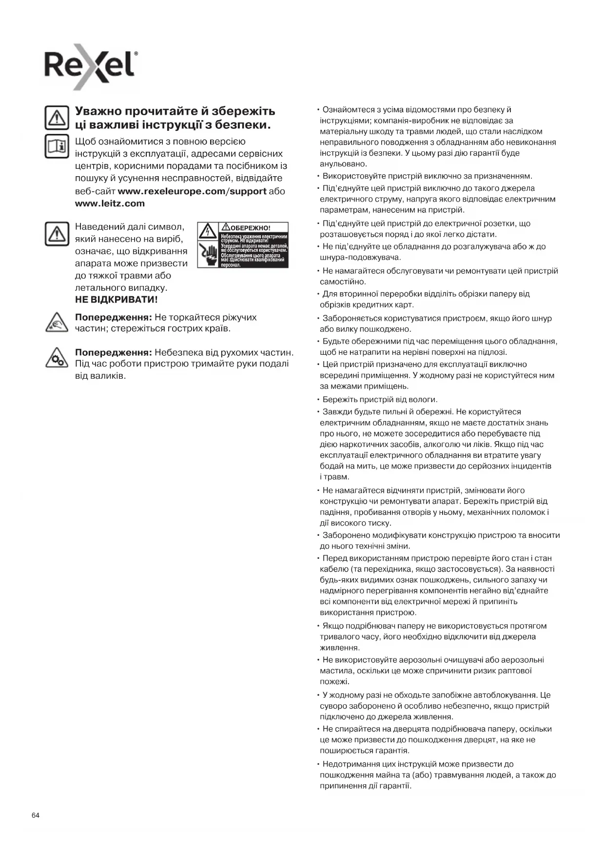 - Недотримання цих інструкцій може призвести до пошкодження майна та (або) травмування людей, а також до припинення дії гарантії. Уважно прочитайте й збережіть ці важливі інструкції з безпеки. Щоб ознайомитися з повною версією інструкцій з експлуатації, адресами сервісних центрів, корисними порадами та посібником із пошуку й усунення несправностей, відвідайте веб-сайт www.rexeleurope.com/support або www.leitz.com Попередження: Не торкайтеся ріжучих частин; стережіться гострих країв. Попередження: Небезпека від рухомих частин. Під час роботи пристрою тримайте руки подалі від валиків.656565 Уникайте потрапляння ювелірних виробів до