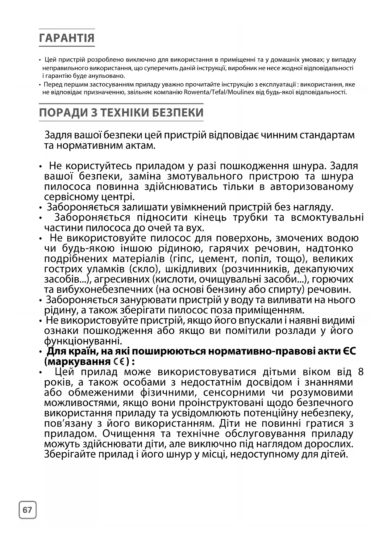 - Перед першим застосуванням приладу уважно прочитайте інструкцію з експлуатації : використання, яке не відповідає призначенню, звільняє компанію Rowenta/Tefal/Moulinex від будь-якої відповідальності. ПОРАДИ З ТЕХНІКИ БЕЗПЕКИ Задля вашої безпеки цей пристрій відповідає чинним стандартам та нормативним актам.
