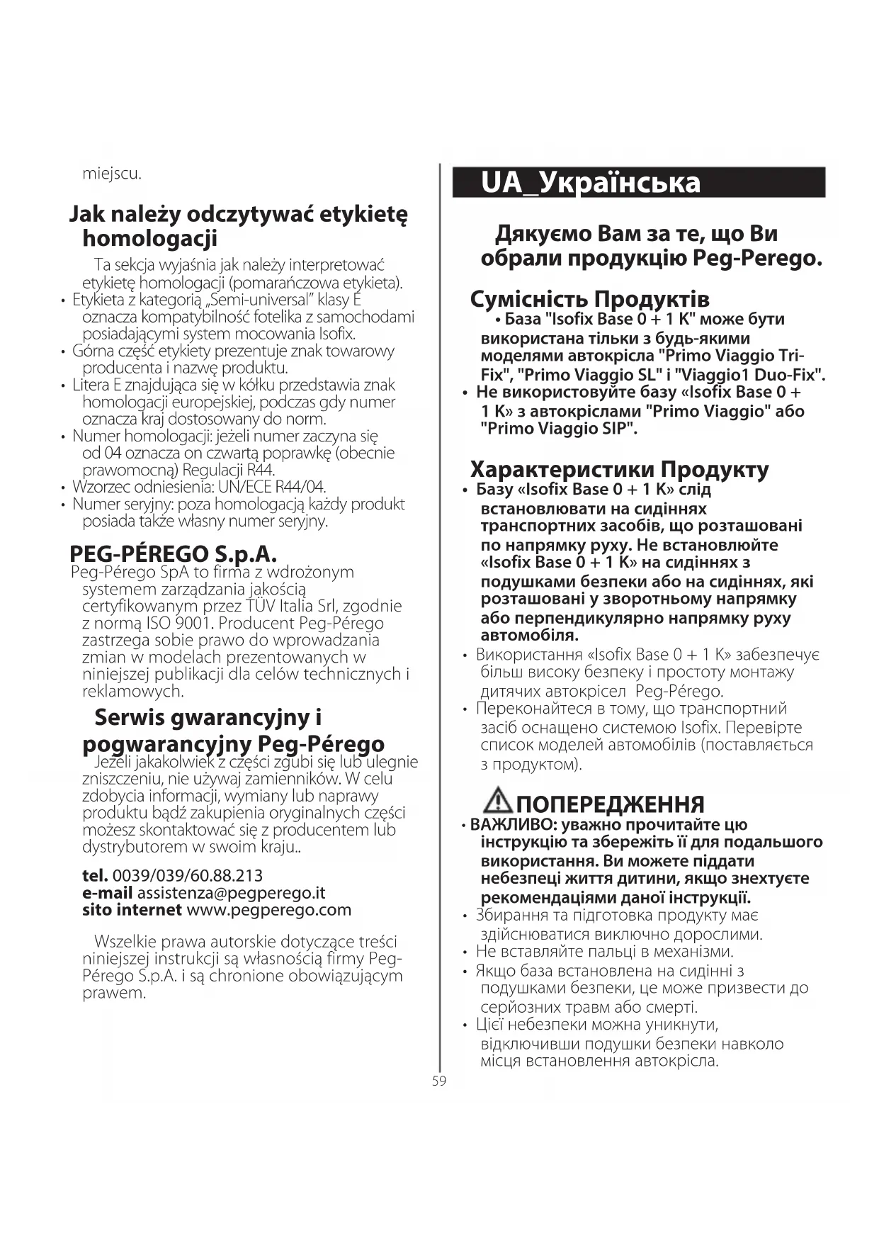 - У разі необхідності ремонту, заміни деталей, отримання інформації про продукти та аксесуари, будь ласка, зв'яжіться з локальним дистриб’ютором Peg-Pérego в Україні (з серійним номером продукту та гарантійним талоном).