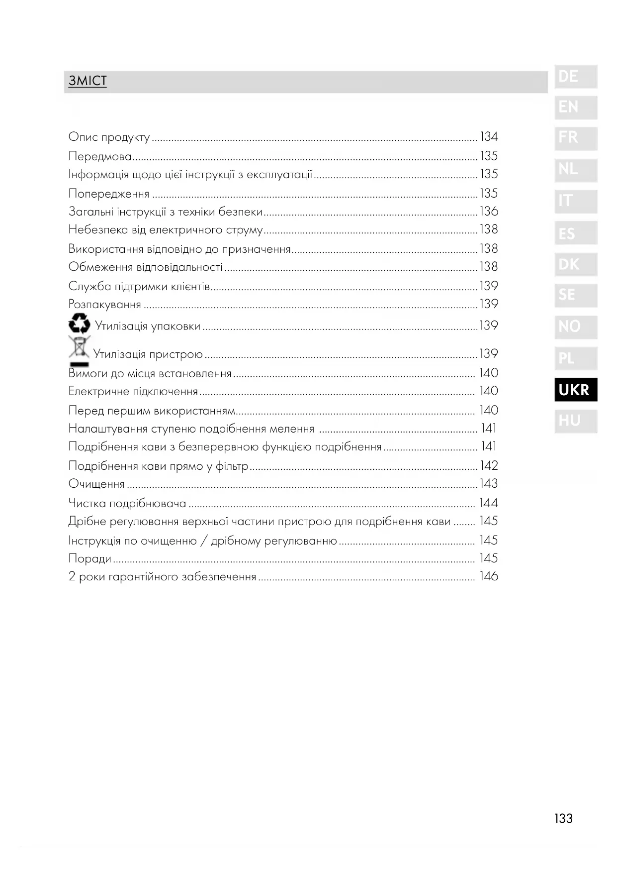 - Подрібнення кави з безперервною функцією подрібнення p. 141