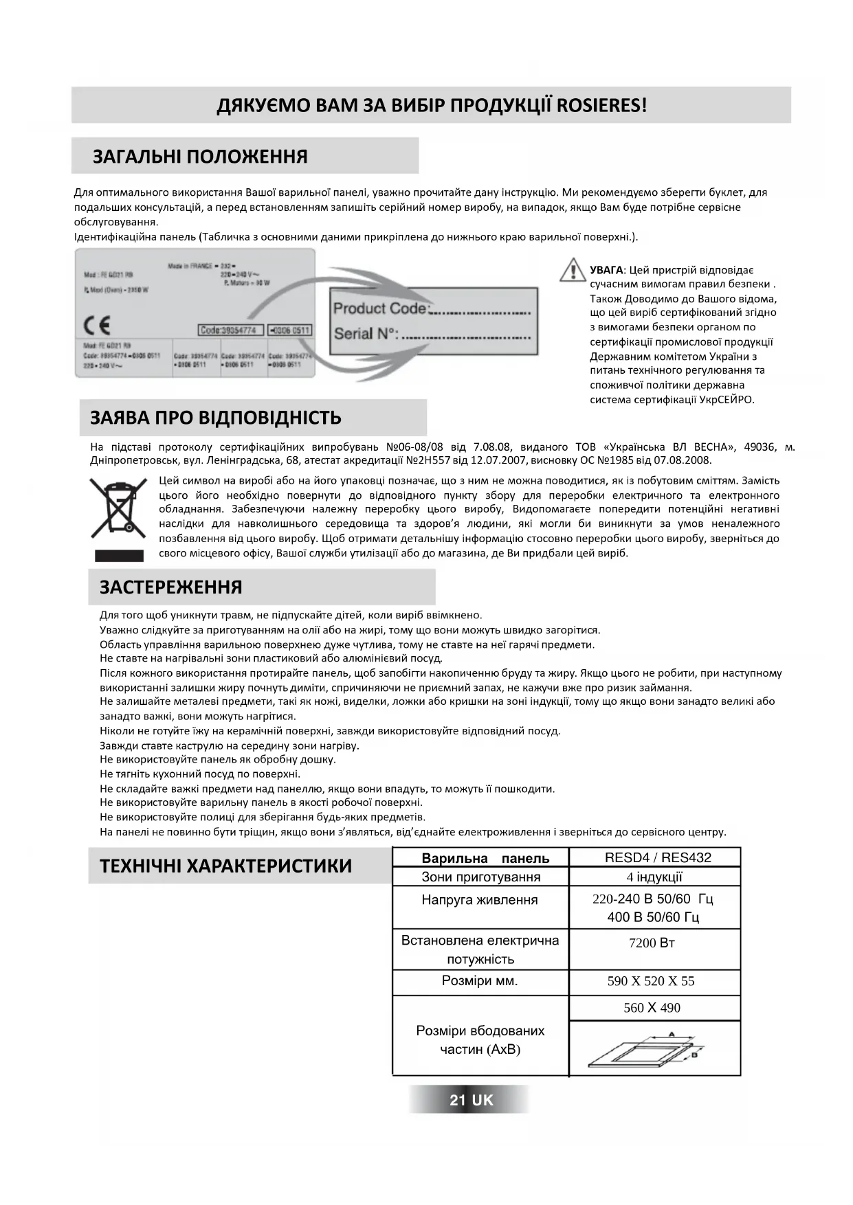 - The on-off cycles vary according to the required heat level: - low level: short operating time, - high level: long operating time.ДЯКУЄМО ВАМ ЗА ВИБІР ПРОДУКЦІЇ ROSIERES! ЗАГАЛЬНІ ПОЛОЖЕННЯ Длѐ оптимального використаннѐ Вашої варильної панелі, уважно прочитайте дану інструкція. Ми рекомендуюмо зберегти буклет, длѐ подальших консультацій, а перед встановленнѐм запишіть серійний номер виробу, на випадок, ѐкщо Вам буде потрібне сервісне обслуговуваннѐ. Ідентифікаційна панель (Табличка з основними даними прикріплена до нижнього края варильної поверхні.). ЗАСТЕРЕЖЕННЯ УВАГА: Цей пристрій відповідаю сучасним вимогам правил безпеки . Також Доводимо до Вашого відома, що цей виріб сертифікований згідно з вимогами безпеки органом по сертифікації промислової продукції Державним комітетом України з питань технічного регуляваннѐ та споживчої політики державна система сертифікації УкрСЕЙРО. ЗАЯВА ПРО ВІДПОВІДНІСТЬ На підставі протоколу сертифікаційних випробувань №06-08/08 від 7.08.08, виданого ТОВ «Українська ВЛ ВЕСНА», 49036, м. Дніпропетровськ, вул. Ленінградська, 68, атестат акредитації №2Н557 від 12.07.2007, висновку ОС №1985 від 07.08.2008. Цей символ на виробі або на його упаковці позначаю, що з ним не можна поводитисѐ, ѐк із побутовим сміттѐм. Замість цього його необхідно повернути до відповідного пункту збору длѐ переробки електричного та електронного обладнаннѐ. Забезпечуячи належну переробку цього виробу, Видопомагаюте попередити потенційні негативні наслідки длѐ навколишнього середовища та здоров’ѐ лядини, ѐкі могли би виникнути за умов неналежного позбавленнѐ від цього виробу. Щоб отримати детальнішу інформація стосовно переробки цього виробу, звернітьсѐ до свого місцевого офісу, Вашої служби утилізації або до магазина, де Ви придбали цей виріб. Длѐ того щоб уникнути травм, не підпускайте дітей, коли виріб ввімкнено. Уважно слідкуйте за приготуваннѐм на олії або на жирі, тому що вони можуть швидко загорітисѐ. Область управліннѐ варильноя поверхнея дуже чутлива, тому не ставте на неї гарѐчі предмети. Не ставте на нагрівальні зони пластиковий або алямініювий посуд. Післѐ кожного використаннѐ протирайте панель, щоб запобігти накопичення бруду та жиру. Якщо цього не робити, при наступному використанні залишки жиру почнуть диміти, спричинѐячи не приюмний запах, не кажучи вже про ризик займаннѐ. Не залишайте металеві предмети, такі ѐк ножі, виделки, ложки або кришки на зоні індукції, тому що ѐкщо вони занадто великі або занадто важкі, вони можуть нагрітисѐ. Ніколи не готуйте їжу на керамічній поверхні, завжди використовуйте відповідний посуд. Завжди ставте каструля на середину зони нагріву. Не використовуйте панель ѐк обробну дошку. Не тѐгніть кухонний посуд по поверхні. Не складайте важкі предмети над панелля, ѐкщо вони впадуть, то можуть її пошкодити. Не використовуйте варильну панель в ѐкості робочої поверхні. Не використовуйте полиці длѐ зберіганнѐ будь-ѐких предметів. На панелі не повинно бути тріщин, ѐкщо вони з’ѐвлѐтьсѐ, від’юднайте електроживленнѐ і звернітьсѐ до сервісного центру. ТЕХНІЧНІ ХАРАКТЕРИСТИКИ Варильна панель Зони приготування 4 індукції Напруга живлення 220-240 В 50/60 Гц 400 В 50/60 Гц Встановлена електрична