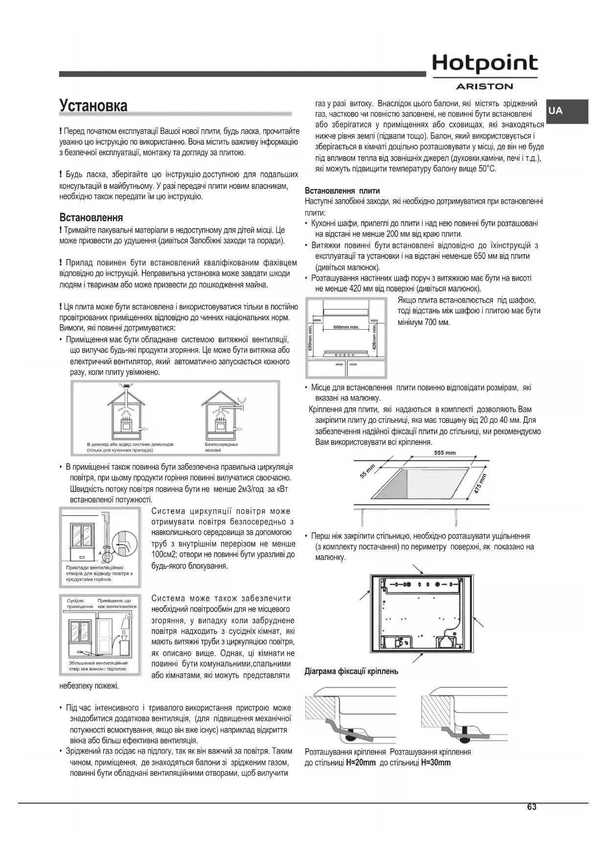 ! Перед початком експлуатації Вашої нової плити, будь ласка, прочитайте уважно цю інструкцію по використанню. Вона містить важливу інформацію з безпечної експлуатації, монтажу та догляду за плитою. ! Будь ласка, зберігайте цю інструкцію доступною для подальших консультацій в майбутньому. У разі передачі плити новим власникам, необхідно також передати їм цю інструкцію. Встановлення ! Тримайте пакувальні матеріали в недоступному для дітей місці. Це може призвести до удушення (дивіться Запобіжні заходи та поради). ! Прилад повинен бути встановлений кваліфікованим фахівцем відповідно до інструкцій. Неправильна установка може завдати шкоди людям і тваринам або може призвести до пошкодження майна. ! Ця плита може бути встановлена і використовуватися тільки в постійно провітрюваних приміщеннях відповідно до чинних національних норм. Вимоги, які повинні дотримуватися: