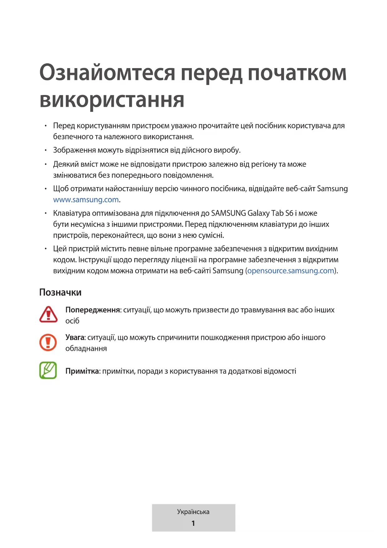 Клавіатура оптимізована для підключення до SAMSUNG Galaxy Tab S6 і може бути несумісна з іншими пристроями. Перед підключенням клавіатури до інших пристроїв, переконайтеся, що вони з нею сумісні.