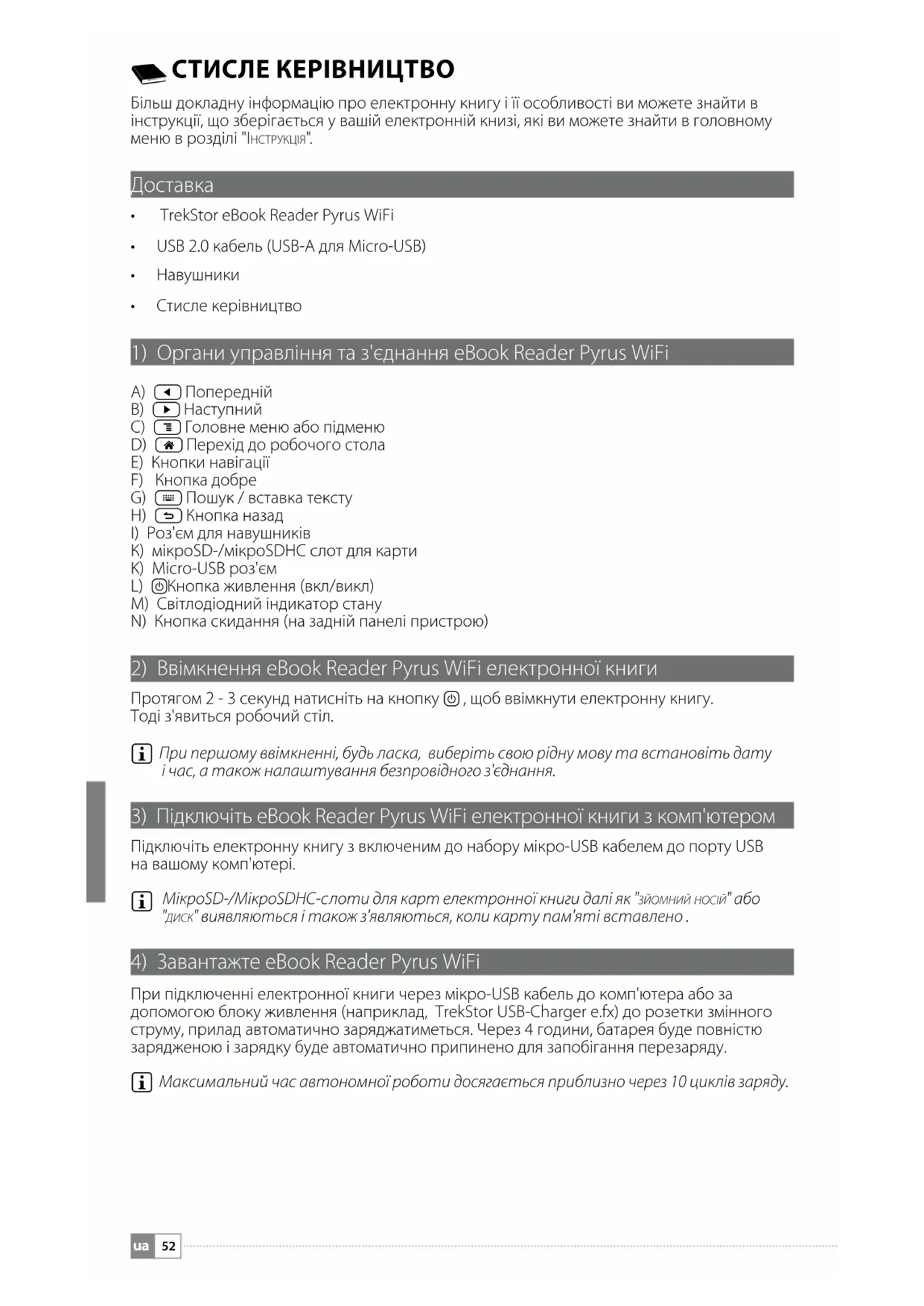 СтиСле керівництво Більш докладну інформацію про електронну книгу і її особливості ви можете знайти в інструкції, що зберігається у вашій електронній книзі, які ви можете знайти в головному меню в розділі "ІнструкцІя".