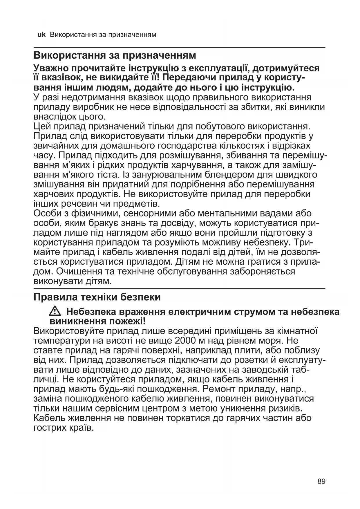 У разі недотримання вказівок щодо правильного використання приладу виробник не несе відповідальності за збитки, які виникли внаслідок цього. Цей прилад призначений тільки для побутового використання. Прилад слід використовувати тільки для переробки продуктів у звичайних для домашнього господарства кількостях і відрізках часу. Прилад підходить для розмішування, збивання та перемішу- вання м’яких і рідких продуктів харчування, а також для замішу- вання м’якого тіста. Із занурювальним блендером для швидкого змішування вiн придатний для подрібнення або перемішування харчових продуктів. Не використовуйте прилад для переробки інших речовин чи предметів. Особи з фізичними, сенсорними або ментальними вадами або особи, яким бракує знань та досвіду, можуть користуватися при- ладом лише під наглядом або якщо вони пройшли підготовку з користування приладом та розуміють можливу небезпеку. Три- майте прилад і кабель живлення подалі від дітей, їм не дозволя- ється користуватися приладом. Дітям не можна гратися з прила- дом. Очищення та технічне обслуговування забороняється виконувати дітям.