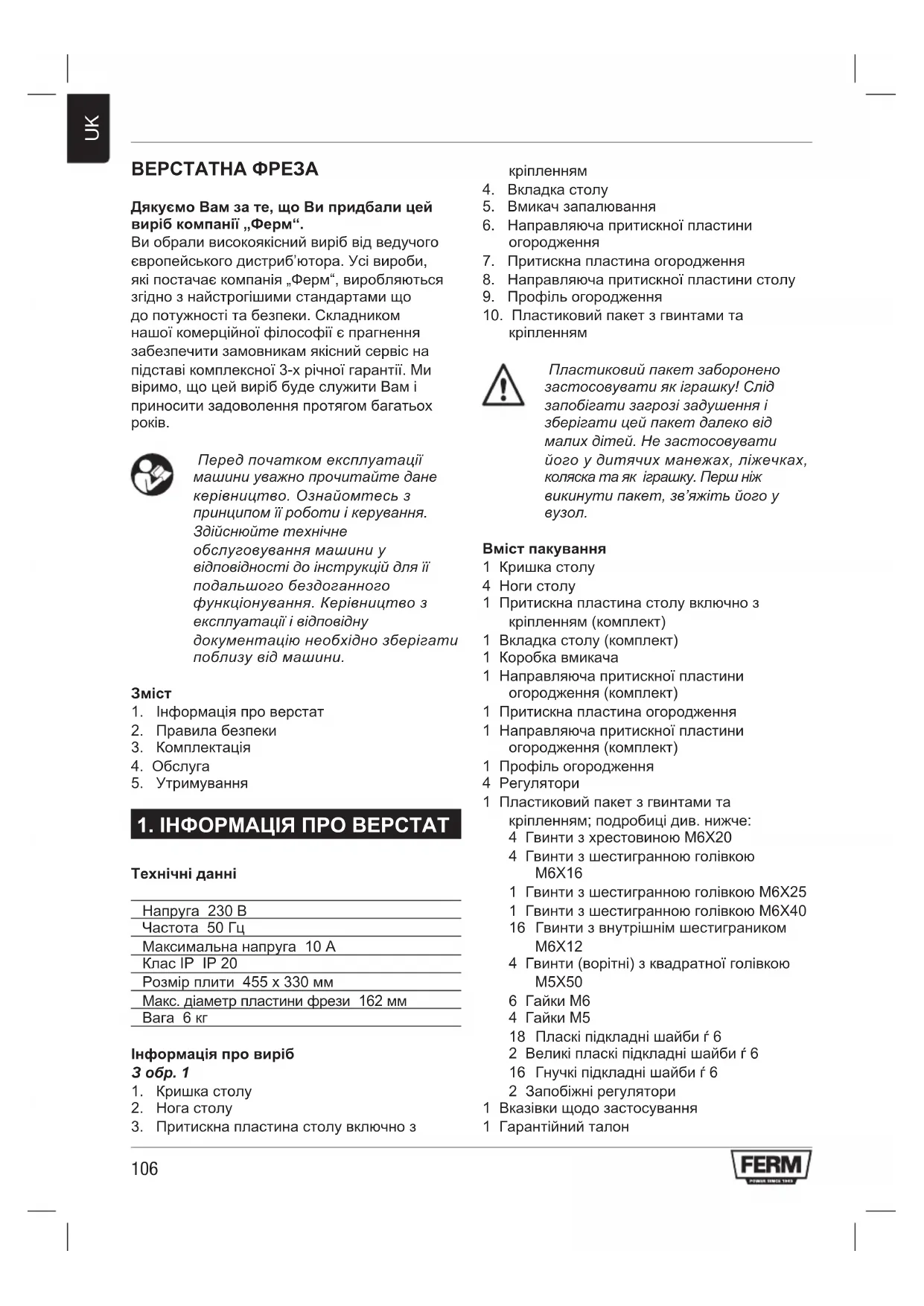 ВЕРСТАТНА ФРЕЗА Дякуємо Вам за те, що Ви придбали цей виріб компанії „Ферм“. Ви обрали високоякісний виріб від ведучого європейського дистриб’ютора. Усі вироби, які постачає компанія „Ферм“, виробляються згідно з найстрогішими стандартами що до потужності та безпеки. Складником нашої комерційної філософії є прагнення забезпечити замовникам якісний сервіс на підставі комплексної 3-х річної гарантії. Ми віримо, що цей виріб буде служити Вам і приносити задоволення протягом багатьох