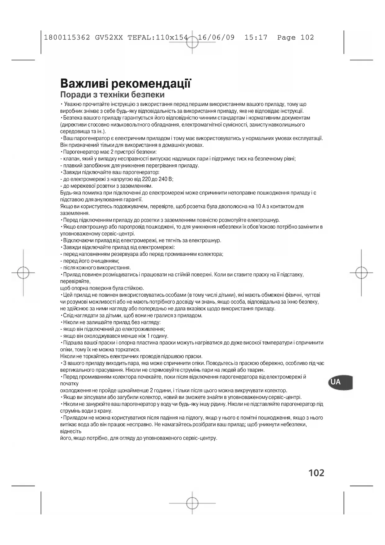 - Для досягнення кращого результату, радимо повторити цю операцiю двiчi. ЯКЩО ПРИ ВИКОРИСТАННІ ПАРОГЕНЕРАТОРА ВИНИКЛА Не знiмайтенiколикришкубойлератодi, колипраскавипускаєпару.Ніколи не ставте праскуна металеву підставку,яка може зіпсувати зповерхню, ставте з наопорну пластину на корпусі: на з поверхні є протиковзні підкладки,а використовуваніматеріали витримуютьвисоку температуру.Якщо ваша вода маєпiдвищений вмiсткальцiю, робiть цечастiше. Головне - незастосовуйте засоби,що видаляють накипдля промиваннябойлера: вониможуть йогопошкодити. Проблеми Можливі при ч и н и Способи усун е н н я Парогенератор не вмикається або ж світловий індикатор праски не горить. Прилад не включений під напругу. Перевірте, щоб під час увімкнення прилад був як слід підключений через розетку до електромережі і був під напругою. Через отвори в підошві витікає вода. Термостат неправильно відрегульований, і температура занадто низька. Зверніться до уповноваженого сервіс-центру. Ви почали використовувати праску ще до того, як вона нагрілася до потрібної температури. Перевірте, чи правильно відрегульований термостат. Перед подачею пари почекайте, поки не погасне індикатор праски. 1800115362 GV52XX TEFAL:110x154 16/06/09 15:17 Page 105106 Якщо неможливо визначити причину несправності, зверніться до уповноваженого сервіс-центру. Подбаймо про захист довкілля! ! Ваш прилад містить багато матеріалів, які можуть бути перероблені або повторно використані. ! Здайте прилад після завершення терміну його служби до спеціалізованого центру приймання побутових приладів, а за відсутності такого – до уповноваженого сервіс- центру для належної переробки. Проблеми Можливі при ч и н и Способи усун е н н я Через отвори в підошві