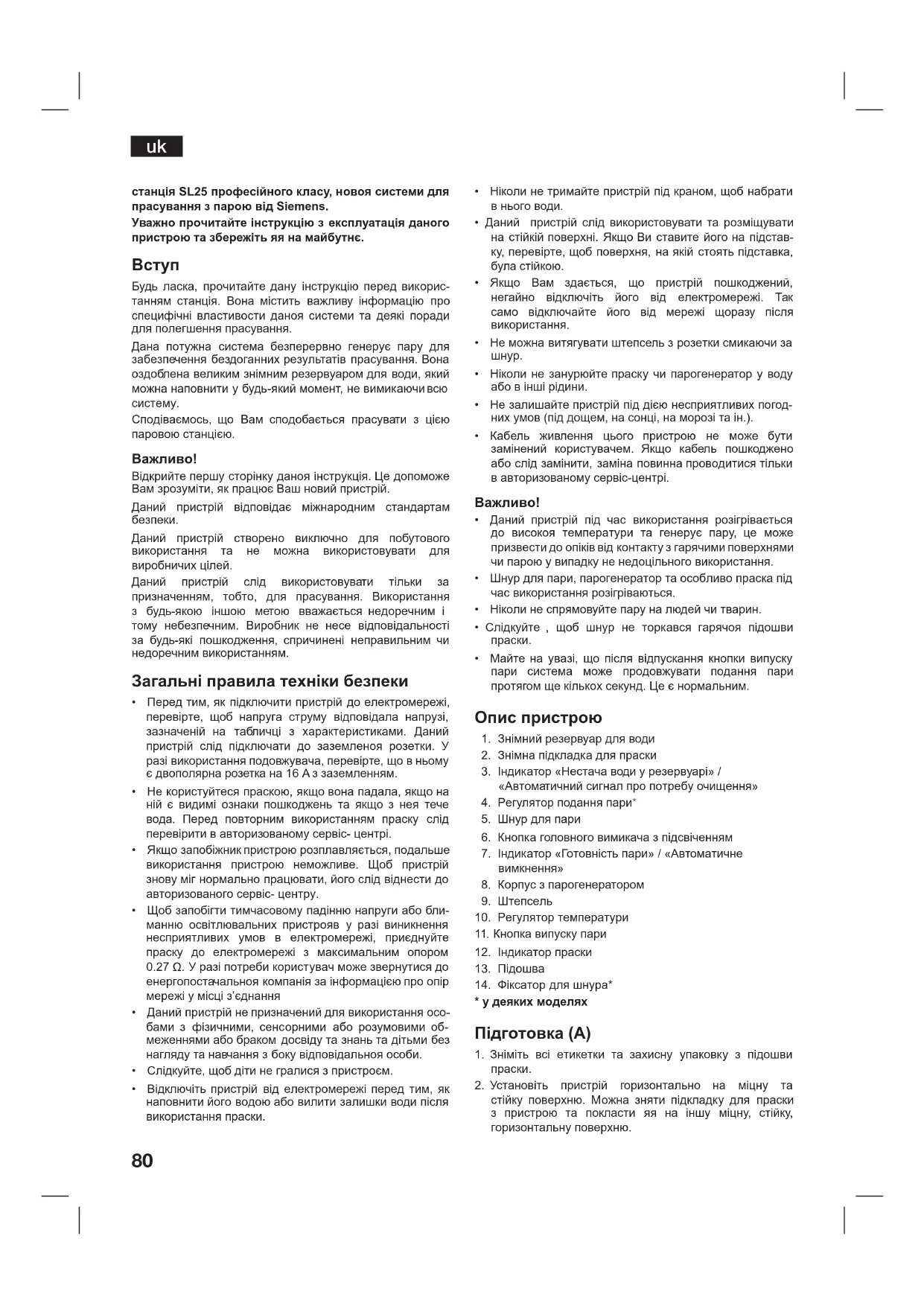 Будь ласка, прочитайте дану інструкцію перед викорис- танням станція. Вона містить важливу інформацію про специфічні властивости даноя системи та деякі поради для полегшення прасування. Дана потужна система безперервно генерує пару для забезпечення бездоганних результатів прасування. Вона оздоблена великим знімним резервуаром для води, який можна наповнити у будь-який момент, не вимикаючи