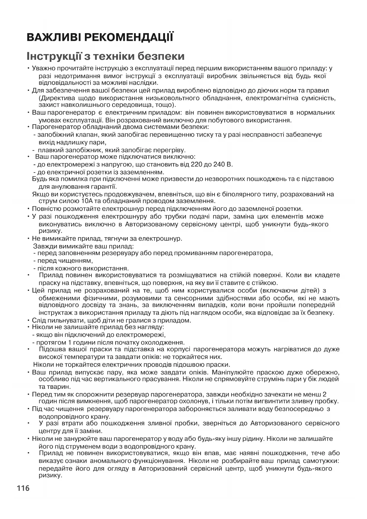 - У разі пошкодження електрошнуру або трубки подачі пари, заміна цих елементів може виконуватись виключно в Авторизованому сервісному центрі, щоб уникнути будь-якого
