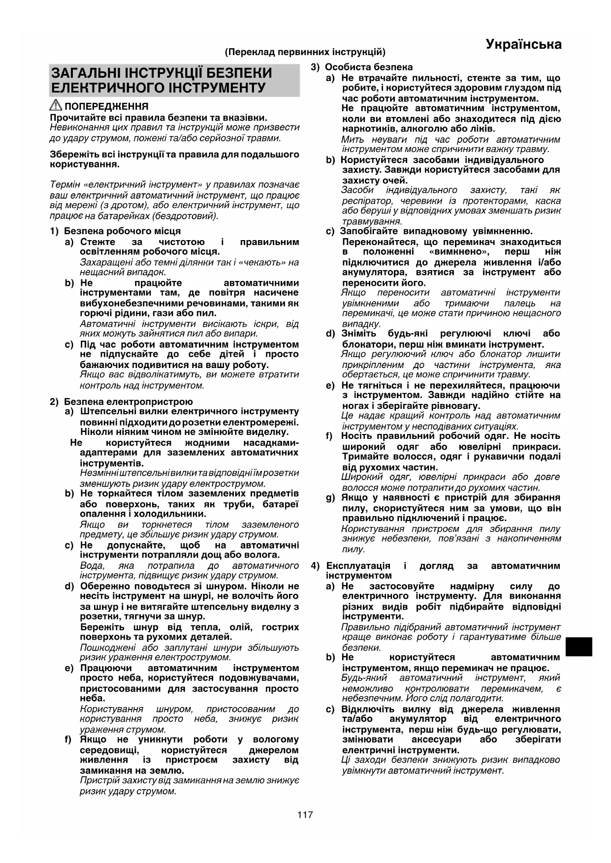 b) Не користуйтеся автоматичним інструментом, якщо перемикач не працює. Будь-який автоматичний інструмент, який неможливо контролювати перемикачем, є небезпечним. Його слід полагодити. c) Відключіть вилку від джерела живлення та/або акумулятор від електричного інструмента, перш ніж будь-що регулювати, змінювати аксесуари або зберігати електричні інструменти. Ці заходи безпеки знижують ризик випадково увімкнути автоматичний інструмент. ЗАГАЛЬНІ ІНСТРУКЦІЇ БЕЗПЕКИ ЕЛЕКТРИЧНОГО ІНСТРУМЕНТУ ПОПЕРЕДЖЕННЯ Прочитайте всі правила безпеки та вказівки. Невиконання цих правил та інструкцій може призвести до удару струмом, пожежі та/або серйозної травми. Збережіть всі інструкції та правила для подальшого користування. Термін «електричний інструмент» у правилах позначає ваш електричний автоматичний інструмент, що працює від мережі (з дротом), або електричний інструмент, що