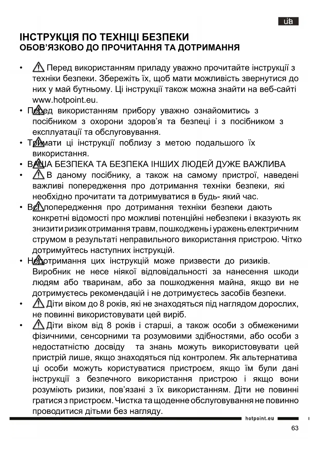 Перед використанням приладу уважно прочитайте інструкції з техніки безпеки. Збережіть їх, щоб мати можливість звернутися до них у май бутньому. Ці інструкції також можна знайти на веб-сайті www.hotpoint.eu.