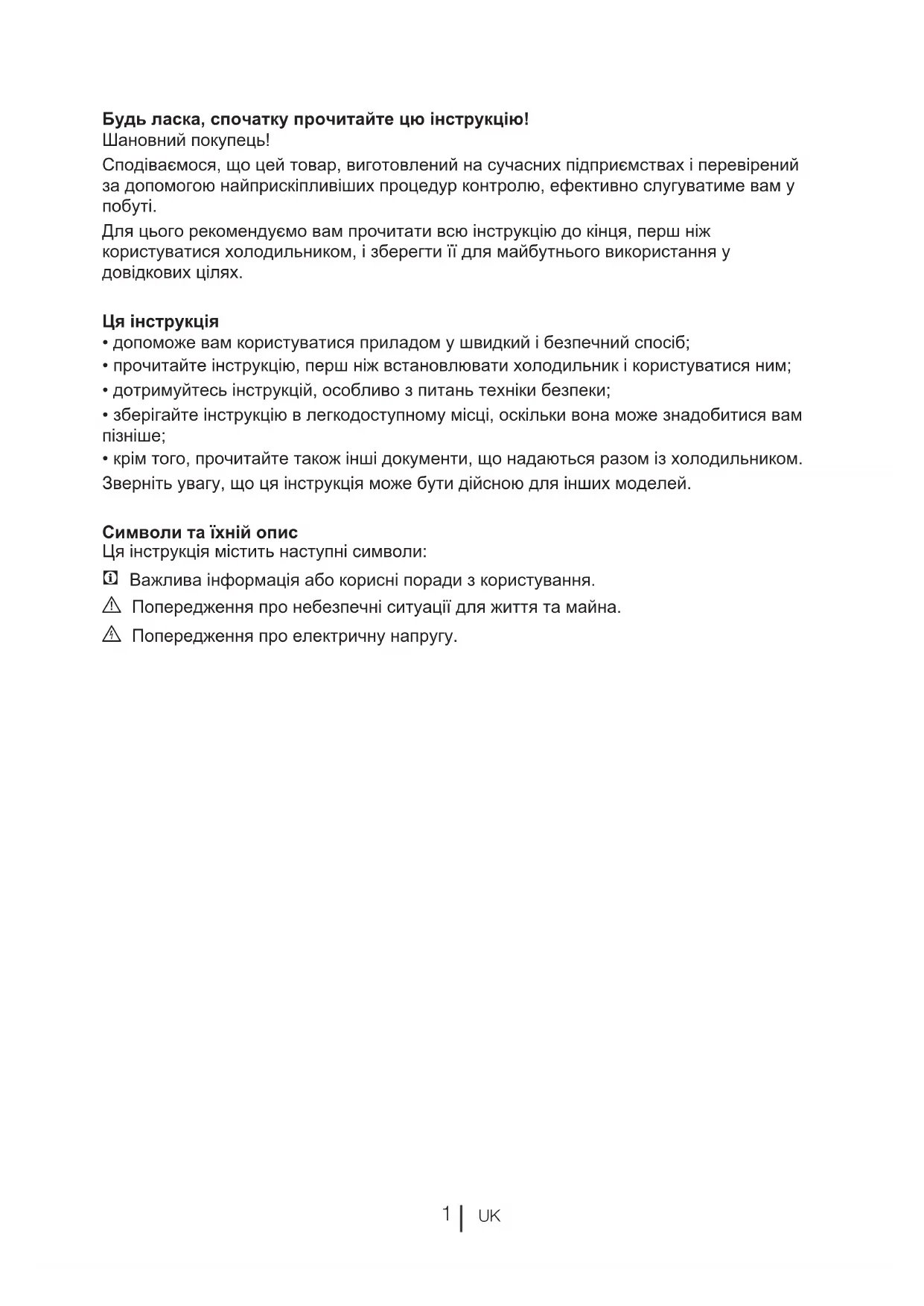 Для цього рекомендуємо вам прочитати всю інструкцію до кінця, перш ніж користуватися холодильником, і зберегти її для майбутнього використання у довідкових цілях. Ця інструкція