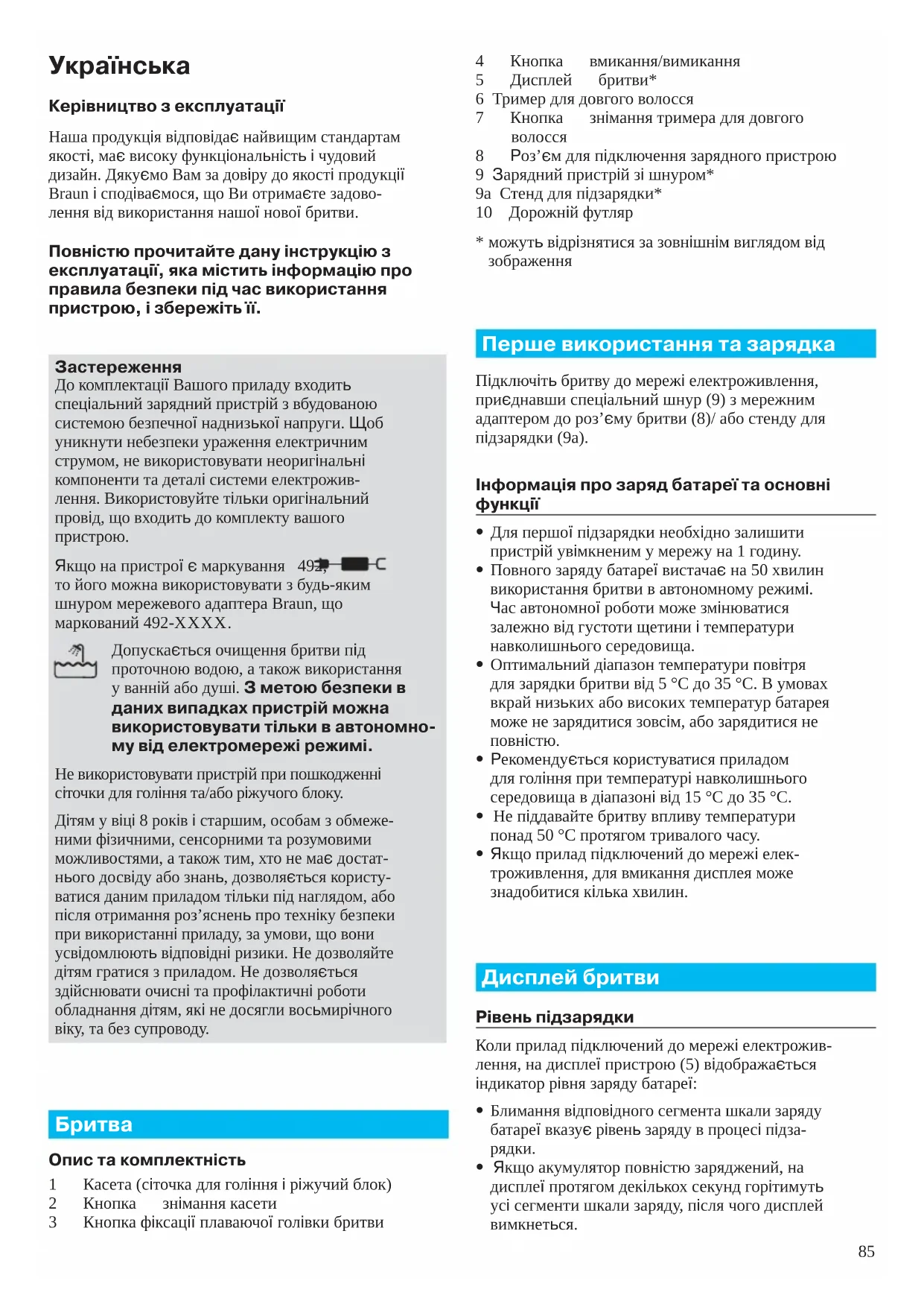 Якщо на пристрої є маркування 492, то його можна використовувати з будь-яким шнуром мережевого адаптера Braun, що маркований 492-ХХХХ. Допускається очищення бритви під проточною водою, а також використання у ванній або душі. З метою безпеки в даних випадках пристрій можна використовувати тільки в автономно- му від електромережі режимі. Не використовувати пристрій при пошкодженні сіточки для гоління та/або ріжучого блоку. Дітям у віці 8 років і старшим, особам з обмеже- ними фізичними, сенсорними та розумовими можливостями, а також тим, хто не має достат- нього досвіду або знань, дозволяється користу- ватися даним приладом тільки під наглядом, або після отримання роз’яснень про техніку безпеки при використанні приладу, за умови, що вони усвідомлюють відповідні ризики. Не дозволяйте дітям гратися з приладом. Не дозволяється здійснювати очисні та профілактичні роботи обладнання дітям, які не досягли восьмирічного віку, та без супроводу.
