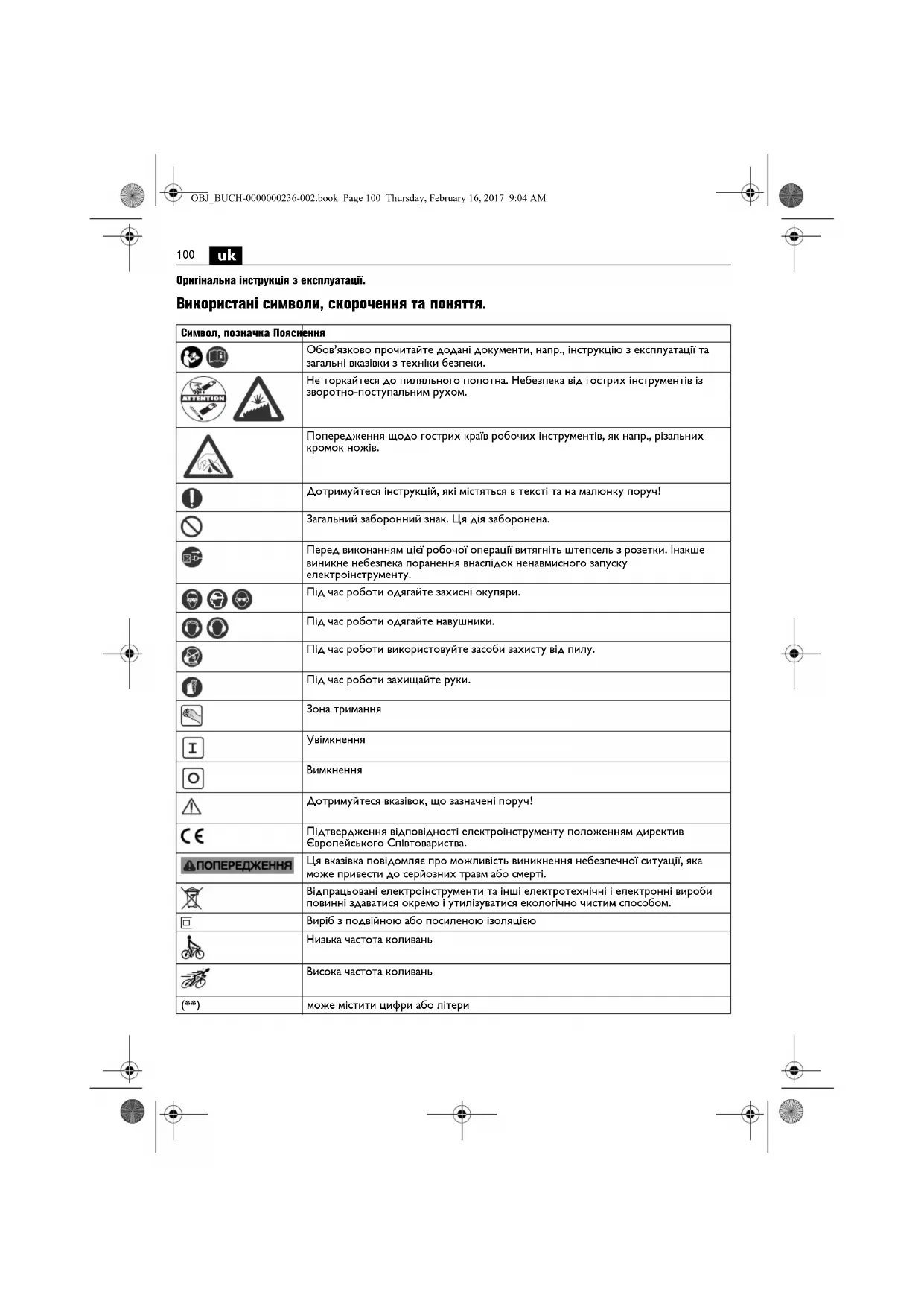 дтвердження відповідності електроінструменту положенням директив Європейського Співтовариства. Ця вказівка повідомляє про можливість виникнення небезпечної ситуації, яка може привести до серйозних травм або смерті. Відпрацьовані електроінструменти та інші електротехнічні і електронні вироби повинні здаватися окремо і утилізуватися екологічно чистим способом. Виріб з подвійною або посиленою ізоляцією Низька частота коливань Висока частота коливань (**) може містити цифри або літери OBJ_BUCH-0000000236-002.book Page 100 Thursday, February 16, 2017 9:04 AM101