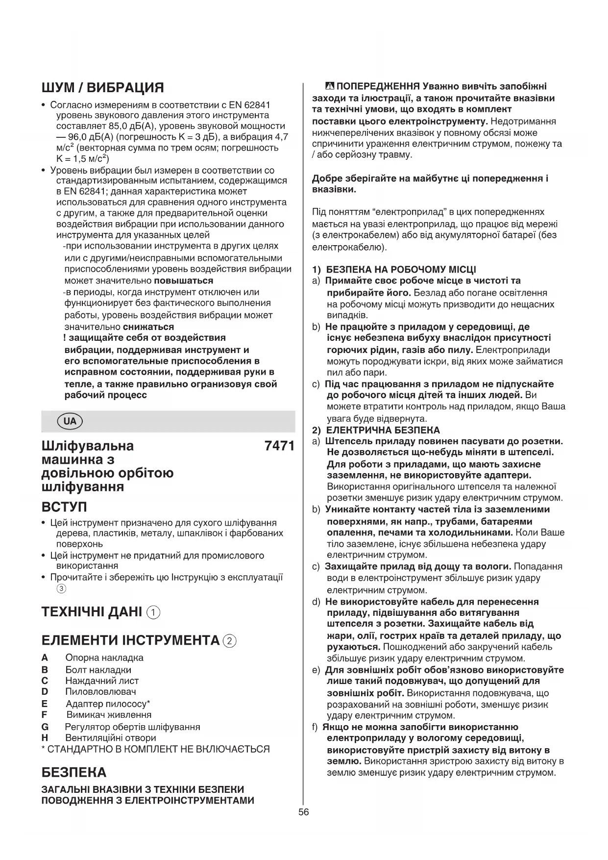 ! во время работы, всегда держите инструмент за места правильного хвата, которые обозначены серым цветом - вести инструмент параллельно рабочей поверхности - не пpикладывайте излишнего давления на инстpумент; позволить шлифовальной поверхности работать за вас - не наклоняйте инструмент во избежание появления нежелательных глубоких царапин56 - ПОПЕРЕДЖЕННЯ Уважно вивчіть запобіжні заходи та ілюстрації, а також прочитайте вказівки та технічні умови, що входять в комплект поставки цього електроінструменту. Недотримання нижчеперелічених вказівок у повному обсязі може спричинити ураження електричним струмом, пожежу та / або серйозну травму. Добре зберігайте на майбутнє ці попередження і