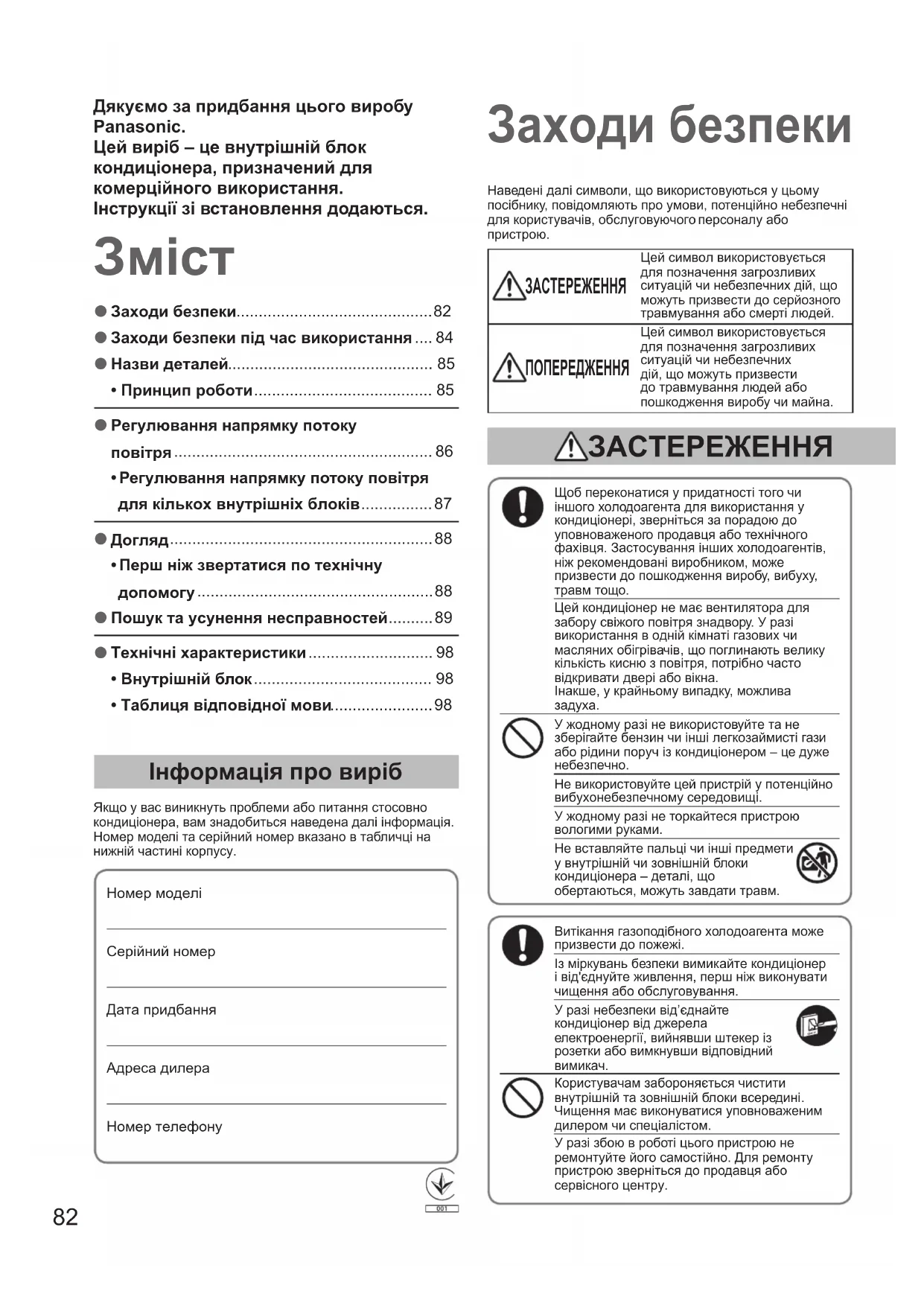 Заходи безпеки Інформація про виріб Якщо у вас виникнуть проблеми або питання стосовно кондиціонера, вам знадобиться наведена далі інформація. Номер моделі та серійний номер вказано в табличці на нижній частині корпусу.Номер моделі Серійний номер Дата придбанняАдреса дилераНомер телефону Щоб переконатися у придатності того чи іншого холодоагента для використання у кондиціонері, зверніться за порадою до уповноваженого продавця або технічного фахівця. Застосування інших холодоагентів, ніж рекомендовані виробником, може призвести до пошкодження виробу, вибуху, травм тощо. Цей кондиціонер не має вентилятора для забору свіжого повітря знадвору. У разі використання в одній кімнаті газових чи масляних обігрівачів, що поглинають велику кількість кисню з повітря, потрібно часто відкривати двері або вікна. Інакше, у крайньому випадку, можлива У жодному разі не використовуйте та не зберігайте бензин чи інші легкозаймисті гази або рідини поруч із кондиціонером – це дуже небезпечно. Не використовуйте цей пристрій у потенційно вибухонебезпечному середовищі. У жодному разі не торкайтеся пристрою вологими руками. Не вставляйте пальці чи інші предмети у внутрішній чи зовнішній блоки кондиціонера – деталі, що обертаються, можуть завдати травм. Витікання газоподібного холодоагента може призвести до пожежі. Із міркувань безпеки вимикайте кондиціонер і від'єднуйте живлення, перш ніж виконувати чищення або обслуговування. У разі небезпеки від’єднайте кондиціонер від джерела електроенергії, вийнявши штекер із розетки або вимкнувши відповідний вимикач.Користувачам забороняється чистити внутрішній та зовнішній блоки всередині. Чищення має виконуватися уповноваженим дилером чи спеціалістом. У разі збою в роботі цього пристрою не ремонтуйте його самостійно. Для ремонту пристрою зверніться до продавця або сервісного центру. Наведені далі символи, що використовуються у цьому посібнику, повідомляють про умови, потенційно небезпечні для користувачів, обслуговуючого персоналу або пристрою. ЗАСТЕРЕЖЕННЯ Цей символ використовується для позначення загрозливих ситуацій чи небезпечних дій, що можуть призвести до серйозного травмування або смерті людей. ПОПЕРЕДЖЕННЯ Цей символ використовується для позначення загрозливих ситуацій чи небезпечних дій, що можуть призвести до травмування людей або пошкодження виробу чи майна. ЗАСТЕРЕЖЕННЯ Дякуємо за придбання цього виробу Panasonic. Цей виріб – це внутрішній блок кондиціонера, призначений для комерційного використання. Інструкції зі встановлення додаються. OI00284010EUall.indb82OI00284010EUall.indb82 2013/11/2914:36:272013/11/2914:36:2783