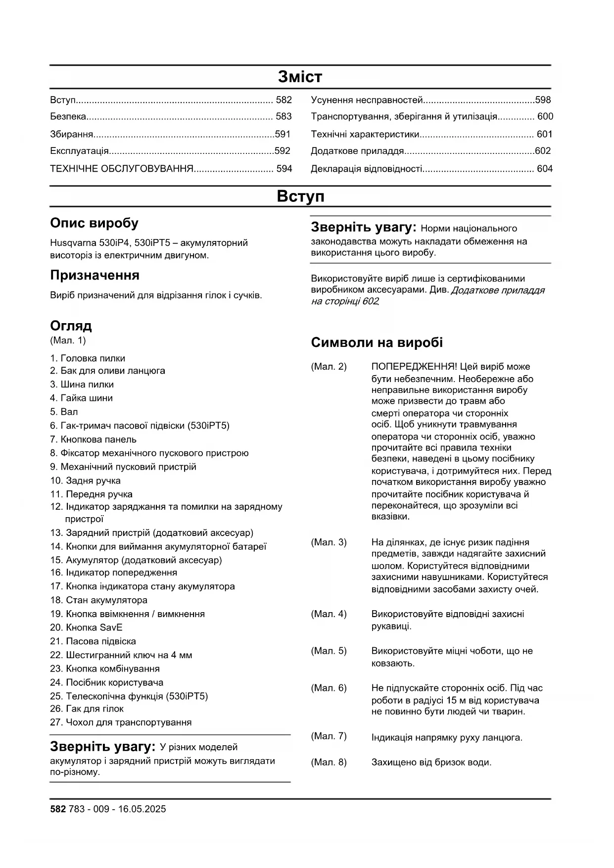 Опис виробу Husqvarna 530iP4, 530iPT5 – акумуляторний висоторіз із електричним двигуном. Призначення Виріб призначений для відрізання гілок і сучків. Зверніть увагу: Норми національного законодавства можуть накладати обмеження на використання цього виробу. Використовуйте виріб лише із сертифікованими виробником аксесуарами. Див. Додаткове приладдя на сторінці 602