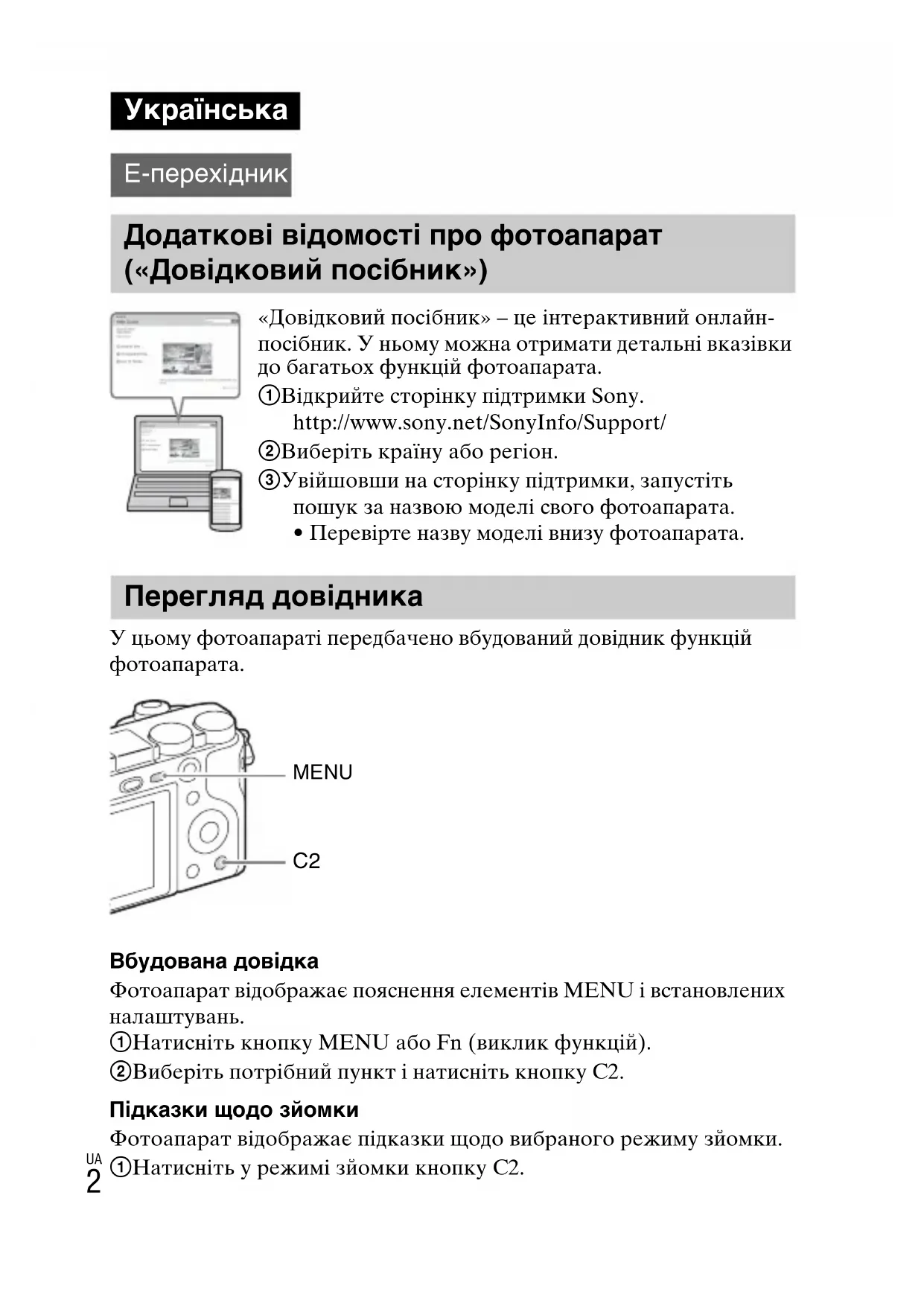 E-перехідник Додаткові відомості про фотоапарат («Довідковий посібник») «Довідковий посібник» – це інтерактивний онлайн- посібник. У ньому можна отримати детальні вказівки до багатьох функцій фотоапарата. 1 Відкрийте сторінку підтримки Sony. http://www.sony.net/SonyInfo/Support/ 2 Виберіть країну або регіон. 3 Увійшовши на сторінку підтримки, запустіть пошук за назвою моделі свого фотоапарата.