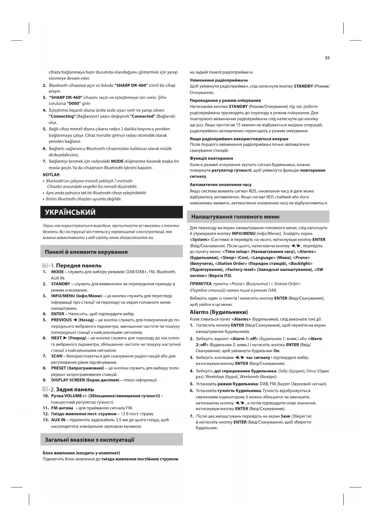насолодитися зовнішньою звуковою музикою. Загальні вказівки з експлуатації Блок живлення (входить у комплект) Підключіть блок живлення до гнізда живлення постійним струмом на задній панелі радіоприймача. Увімкнення радіоприймача Щоб увімкнути радіоприймач, слід натиснути кнопку STANDBY (Режим/ Очікування). Переведення у режим очікування Натискання кнопки STANDBY (Режим/Очікування) під час роботи радіоприймача призводить до переходу в режим очікування. Для повторного ввімкнення радіоприймача слід натиснути цю кнопку ще раз. Якщо протягом 15 хвилин не відбувається жодних операцій, радіоприймач автоматично переходить у режим очікування. Якщо радіоприймач використовується вперше Після першого ввімкнення радіоприймач почне автоматичне сканування станцій. Функція повторення Коли в режимі очікування звучить сигнал будильника, можна повернути регулятор гучності, щоб увімкнути функцію повторення