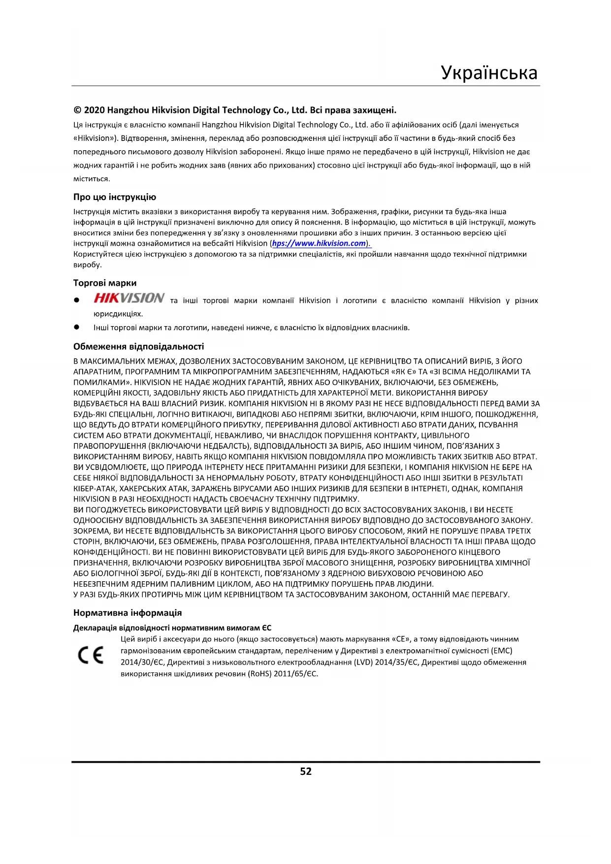 © 2020 Hangzhou Hikvision Digital Technology Co., Ltd. Всі права захищені. Ця інструкція є власністю компанії Hangzhou Hikvision Digital Technology Co., Ltd. або її афілійованих осіб (далі іменується «Hikvision»). Відтворення, змінення, переклад або розповсюдження цієї інструкції або її частини в будь-який спосіб без попереднього письмового дозволу Hikvision заборонені. Якщо інше прямо не передбачено в цій інструкції, Hikvision не дає жодних гарантій і не робить жодних заяв (явних або прихованих) стосовно цієї інструкції або будь-якої інформації, що в ній Про цю інструкцію Інструкція містить вказівки з використання виробу та керування ним. Зображення, графіки, рисунки та будь-яка інша інформація в цій інструкції призначені виключно для опису й пояснення. В інформацію, що міститься в цій інструкції, можуть вноситися зміни без попередження у зв’язку з оновленнями прошивки або з інших причин. З останньою версією цієї інструкції можна ознайомитися на вебсайті Hikvision (https://www.hikvision.com). Користуйтеся цією інструкцією з допомогою та за підтримки спеціалістів, які пройшли навчання щодо технічної підтримки виробу. Торгові марки та інші торгові марки компанії Hikvision і логотипи є власністю компанії Hikvision у різних юрисдикціях. Інші торгові марки та логотипи, наведені нижче, є власністю їх відповідних власників. Обмеження відповідальності В МАКСИМАЛЬНИХ МЕЖАХ, ДОЗВОЛЕНИХ ЗАСТОСОВУВАНИМ ЗАКОНОМ, ЦЕ КЕРІВНИЦТВО ТА ОПИСАНИЙ ВИРІБ, З ЙОГО АПАРАТНИМ, ПРОГРАМНИМ ТА МІКРОПРОГРАМНИМ ЗАБЕЗПЕЧЕННЯМ, НАДАЮТЬСЯ «ЯК Є» ТА «ЗІ ВСІМА НЕДОЛІКАМИ ТА ПОМИЛКАМИ». HIKVISION НЕ НАДАЄ ЖОДНИХ ГАРАНТІЙ, ЯВНИХ АБО ОЧІКУВАНИХ, ВКЛЮЧАЮЧИ, БЕЗ ОБМЕЖЕНЬ, КОМЕРЦІЙНІ ЯКОСТІ, ЗАДОВІЛЬНУ ЯКІСТЬ АБО ПРИДАТНІСТЬ ДЛЯ ХАРАКТЕРНОЇ МЕТИ. ВИКОРИСТАННЯ ВИРОБУ ВІДБУВАЄТЬСЯ НА ВАШ ВЛАСНИЙ РИЗИК. КОМПАНІЯ HIKVISION НІ В ЯКОМУ РАЗІ НЕ НЕСЕ ВІДПОВІДАЛЬНОСТІ ПЕРЕД ВАМИ ЗА БУДЬ-ЯКІ СПЕЦІАЛЬНІ, ЛОГІЧНО ВИТІКАЮЧІ, ВИПАДКОВІ АБО НЕПРЯМІ ЗБИТКИ, ВКЛЮЧАЮЧИ, КРІМ ІНШОГО, ПОШКОДЖЕННЯ, ЩО ВЕДУТЬ ДО ВТРАТИ КОМЕРЦІЙНОГО ПРИБУТКУ, ПЕРЕРИВАННЯ ДІЛОВОЇ АКТИВНОСТІ АБО ВТРАТИ ДАНИХ, ПСУВАННЯ СИСТЕМ АБО ВТРАТИ ДОКУМЕНТАЦІЇ, НЕВАЖЛИВО, ЧИ ВНАСЛІДОК ПОРУШЕННЯ КОНТРАКТУ, ЦИВІЛЬНОГО ПРАВОПОРУШЕННЯ (ВКЛЮЧАЮЧИ НЕДБАЛСТЬ), ВІДПОВІДАЛЬНОСТІ ЗА ВИРІБ, АБО ІНШИМ ЧИНОМ, ПОВ’ЯЗАНИХ З ВИКОРИСТАННЯМ ВИРОБУ, НАВІТЬ ЯКЩО КОМПАНІЯ HIKVISION ПОВІДОМЛЯЛА ПРО МОЖЛИВІСТЬ ТАКИХ ЗБИТКІВ АБО ВТРАТ. ВИ УСВІДОМЛЮЄТЕ, ЩО ПРИРОДА ІНТЕРНЕТУ НЕСЕ ПРИТАМАННІ РИЗИКИ ДЛЯ БЕЗПЕКИ, І КОМПАНІЯ HIKVISION НЕ БЕРЕ НА СЕБЕ НІЯКОЇ ВІДПОВІДАЛЬНОСТІ ЗА НЕНОРМАЛЬНУ РОБОТУ, ВТРАТУ КОНФІДЕНЦІЙНОСТІ АБО ІНШІ ЗБИТКИ В РЕЗУЛЬТАТІ КІБЕР-АТАК, ХАКЕРСЬКИХ АТАК, ЗАРАЖЕНЬ ВІРУСАМИ АБО ІНШИХ РИЗИКІВ ДЛЯ БЕЗПЕКИ В ІНТЕРНЕТІ, ОДНАК, КОМПАНІЯ HIKVISION В РАЗІ НЕОБХІДНОСТІ НАДАСТЬ СВОЄЧАСНУ ТЕХНІЧНУ ПІДТРИМКУ. ВИ ПОГОДЖУЄТЕСЬ ВИКОРИСТОВУВАТИ ЦЕЙ ВИРІБ У ВІДПОВІДНОСТІ ДО ВСІХ ЗАСТОСОВУВАНИХ ЗАКОНІВ, І ВИ НЕСЕТЕ ОДНООСІБНУ ВІДПОВІДАЛЬНІСТЬ ЗА ЗАБЕЗПЕЧЕННЯ ВИКОРИСТАННЯ ВИРОБУ ВІДПОВІДНО ДО ЗАСТОСОВУВАНОГО ЗАКОНУ. ЗОКРЕМА, ВИ НЕСЕТЕ ВІДПОВІДАЛЬНСТЬ ЗА ВИКОРИСТАННЯ ЦЬОГО ВИРОБУ СПОСОБОМ, ЯКИЙ НЕ ПОРУШУЄ ПРАВА ТРЕТІХ СТОРІН, ВКЛЮЧАЮЧИ, БЕЗ ОБМЕЖЕНЬ, ПРАВА РОЗГОЛОШЕННЯ, ПРАВА ІНТЕЛЕКТУАЛЬНОЇ ВЛАСНОСТІ ТА ІНШІ ПРАВА ЩОДО КОНФІДЕНЦІЙНОСТІ. ВИ НЕ ПОВИННІ ВИКОРИСТОВУВАТИ ЦЕЙ ВИРІБ ДЛЯ БУДЬ-ЯКОГО ЗАБОРОНЕНОГО КІНЦЕВОГО ПРИЗНАЧЕННЯ, ВКЛЮЧАЮЧИ РОЗРОБКУ ВИРОБНИЦТВА ЗБРОЇ МАСОВОГО ЗНИЩЕННЯ, РОЗРОБКУ ВИРОБНИЦТВА ХІМІЧНОЇ АБО БІОЛОГІЧ