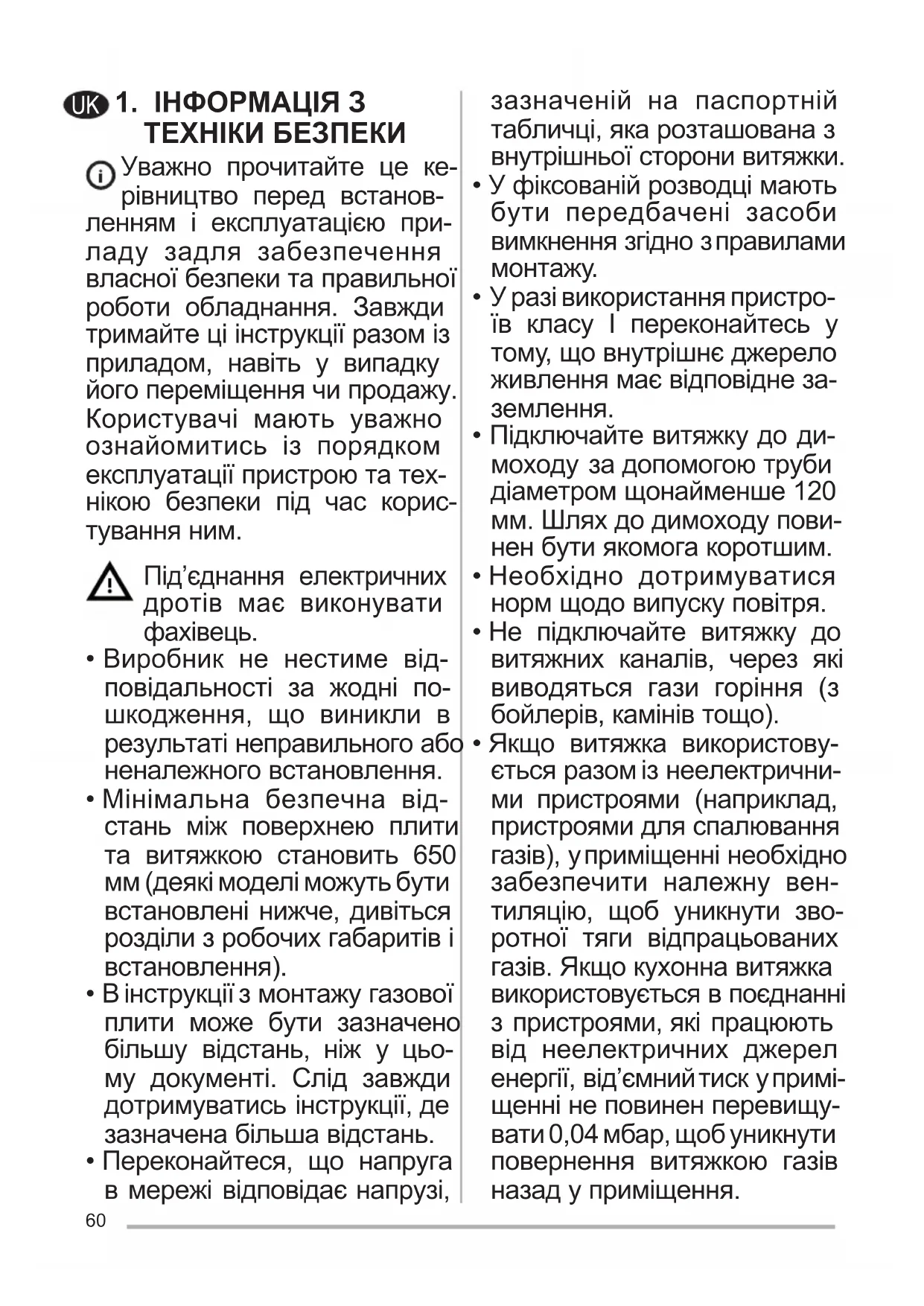 - У разі використання витяж-62 ки одночасно з приладами, які працюють на газі або інших видах палива, необ- хідно передбачити належну вентиляцію приміщення (не застосовується до приладів, які спрямовують потік повітря тільки назад у приміщення).
