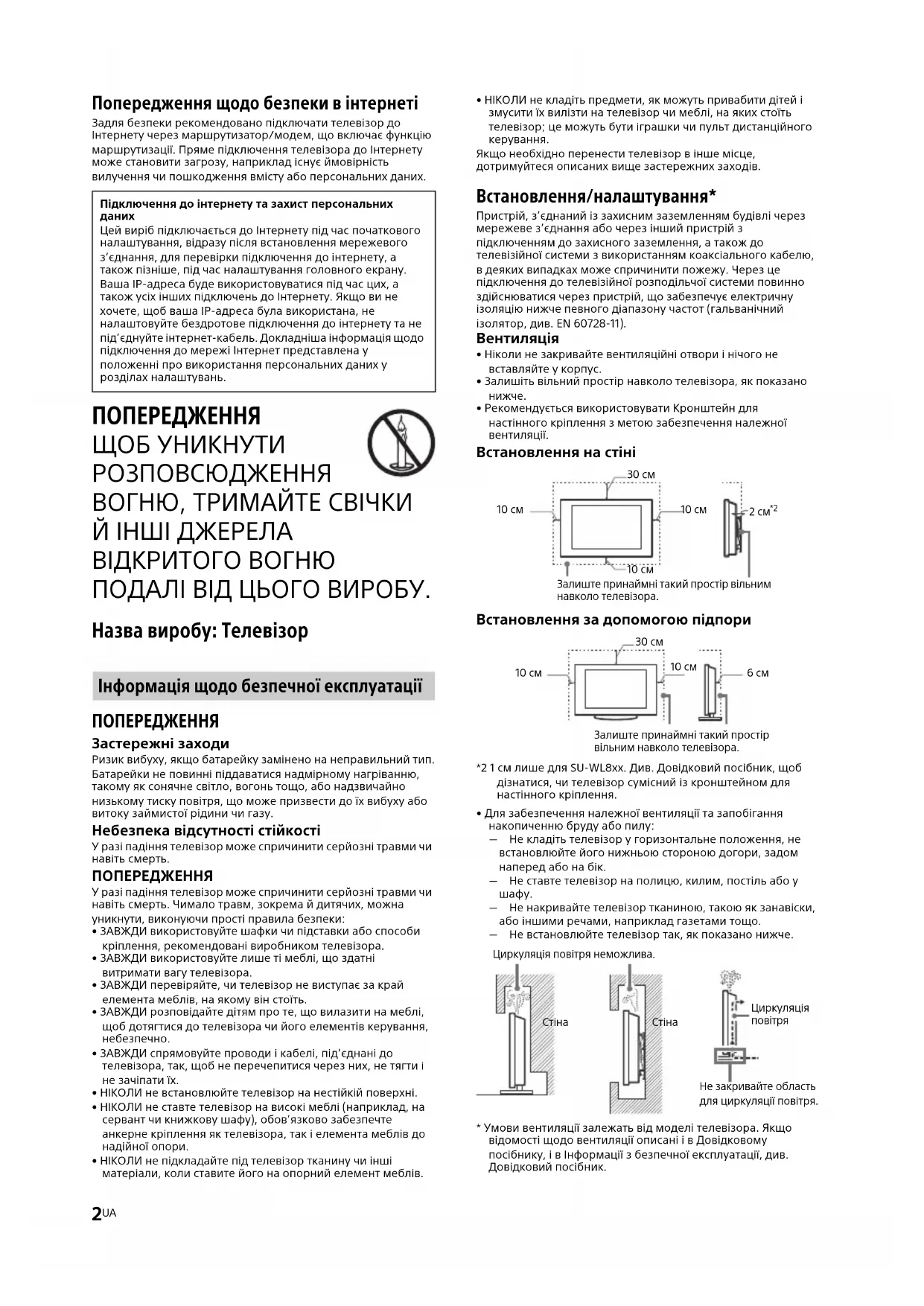 Залиште принаймні такий простір вільним навколо телевізора. 10 см 10 см Залиште принаймні такий простір вільним навколо телевізора. 30 см 10 см 10 см 6 см Циркуляція повітря неможлива.